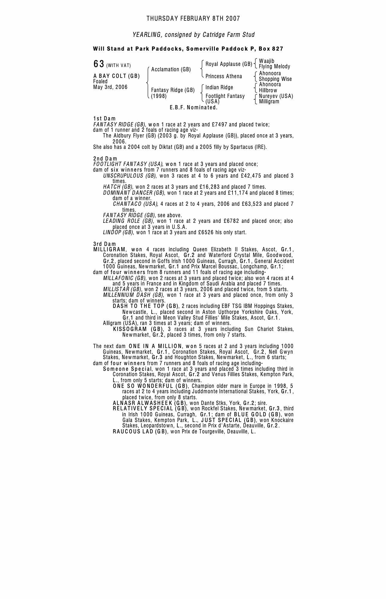 December Yearling Sale 2007 lot 267 C. 2006, Nelson Farm Stud=>Margaret O'Toole 22,000 gns