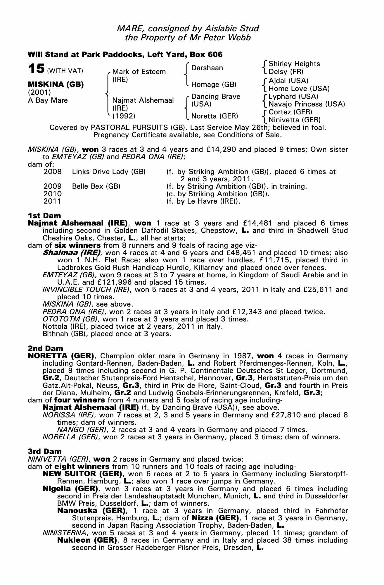 December Mare Sale 2014 lot 2434 Links Drive Lady (GB) (M. by Striking Ambition (GB)), Harper Lodge Stables (D. Ivory)=>Lot Not Sold 24,000 gns