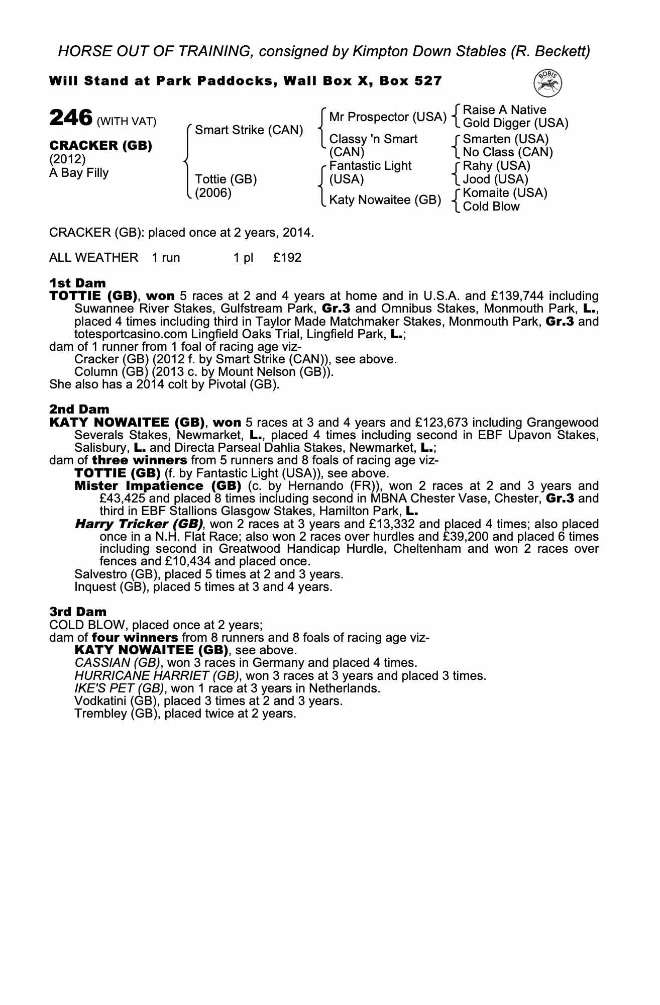 August Sale 2020 lot 241 Mr Luigi (GB) (C. by Bobby's Kitten (USA)), Fitzroy House (M. Bell)=>A C Elliott, Agent 5,000 gns