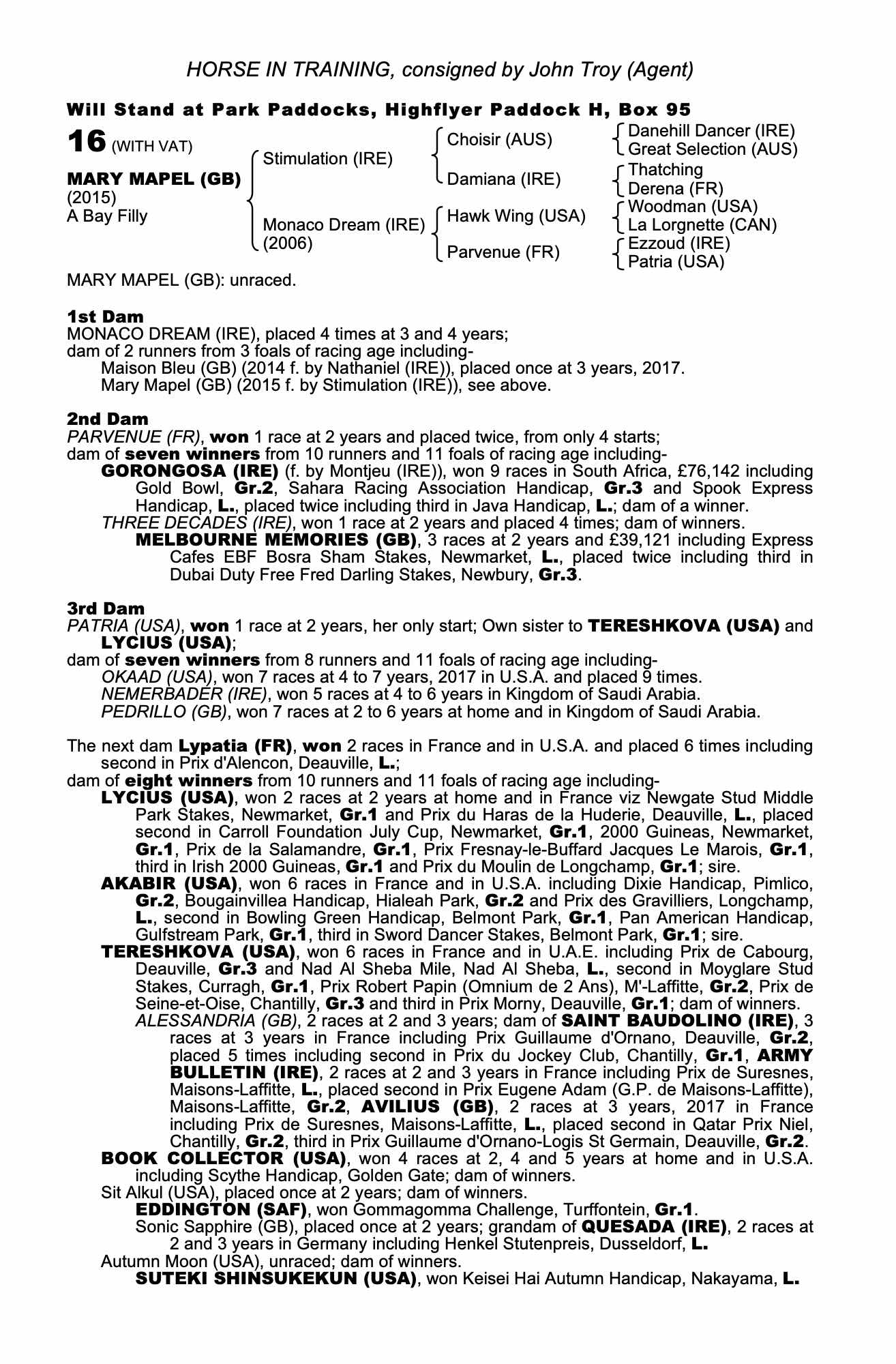 October Yearling Sale, Book 3 2019 lot 1892 F. by Sir Percy (GB) 2018, John Troy (Agent)=>Lot Not Sold 1,800 gns