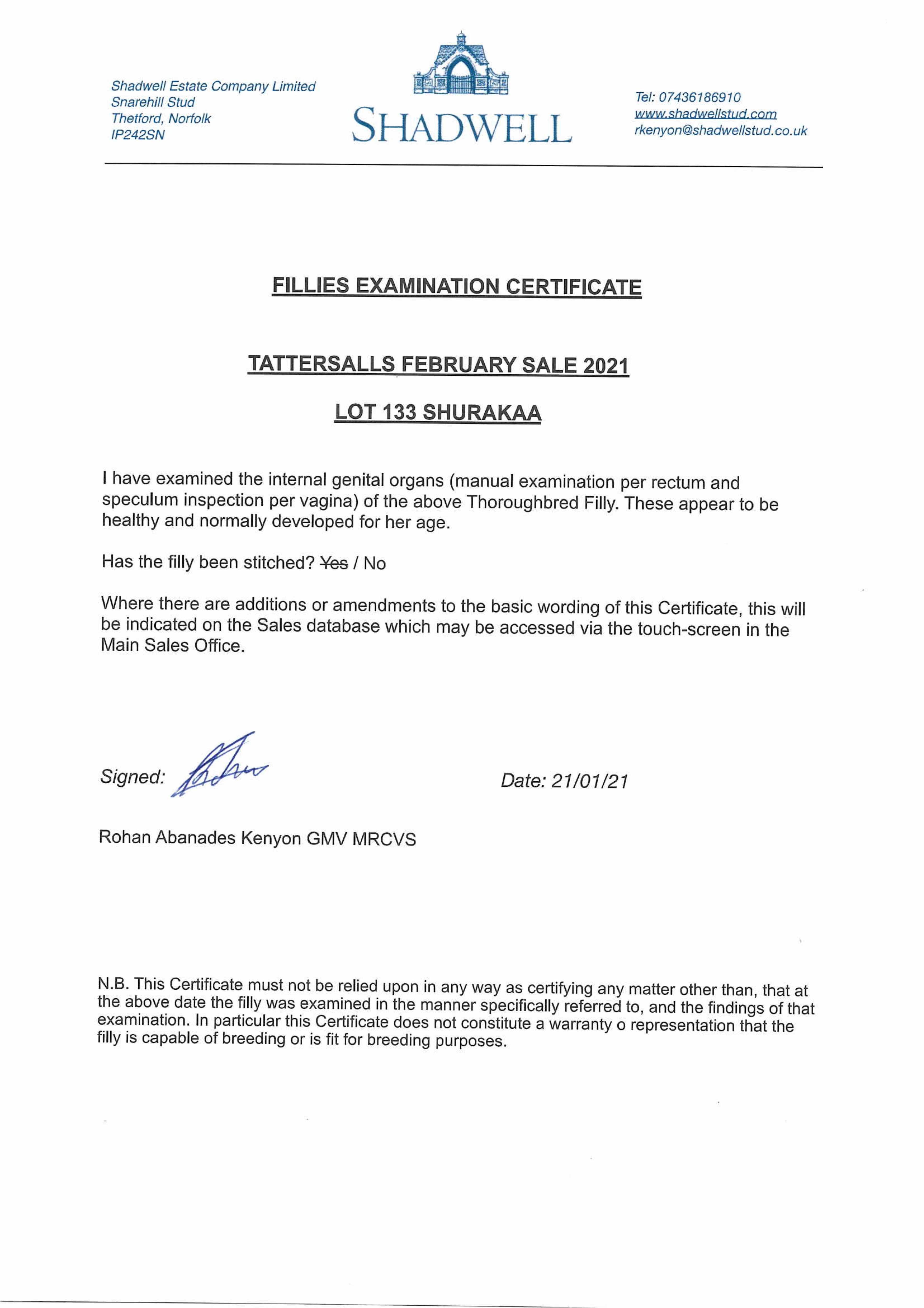 Contact: Dennis O'Brien ✆ +447885492528 ✉ dobrien@shadwellstud.co.uk