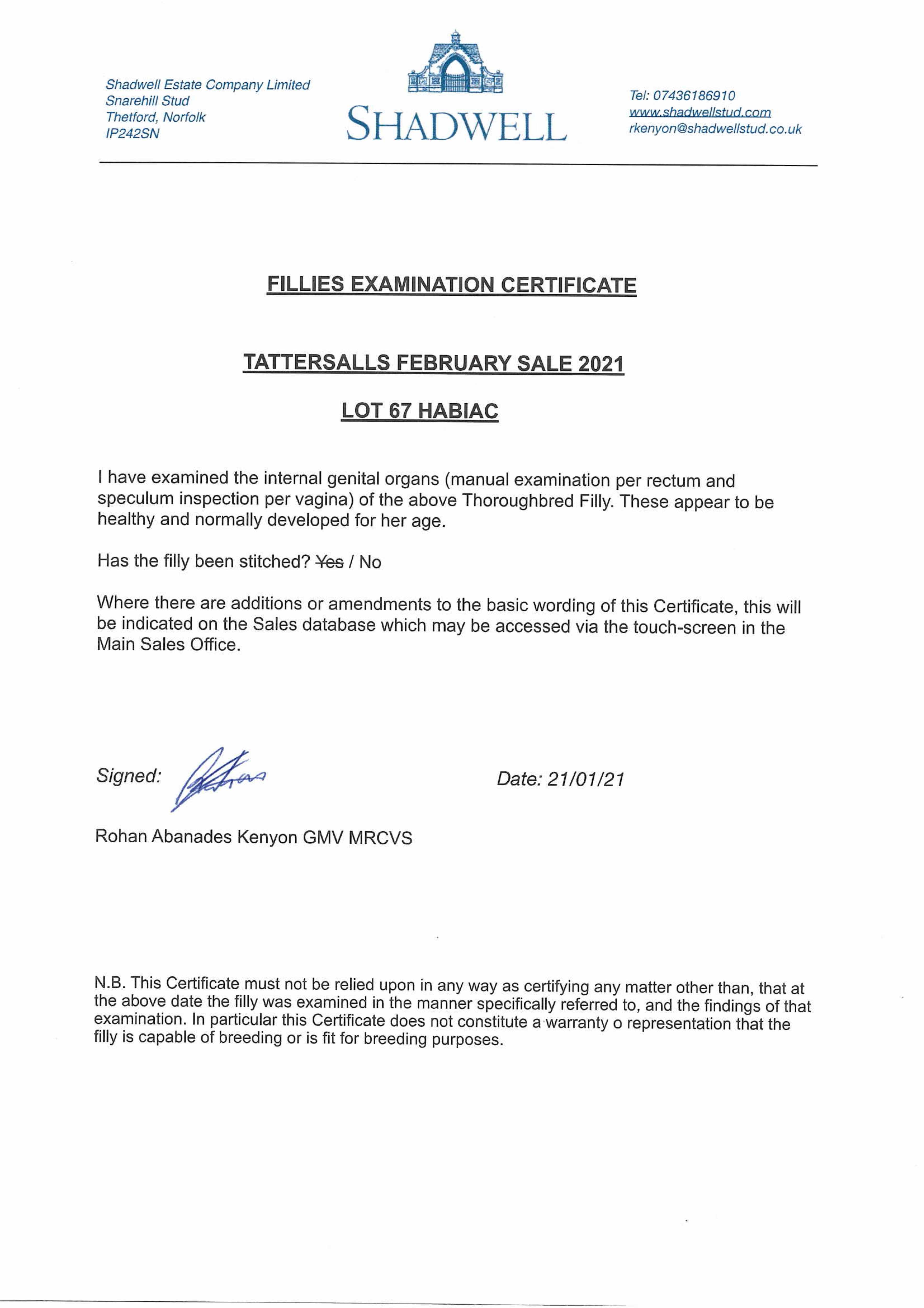 Contact: Dennis O'Brien ✆ +447885492528 ✉ dobrien@shadwellstud.co.uk