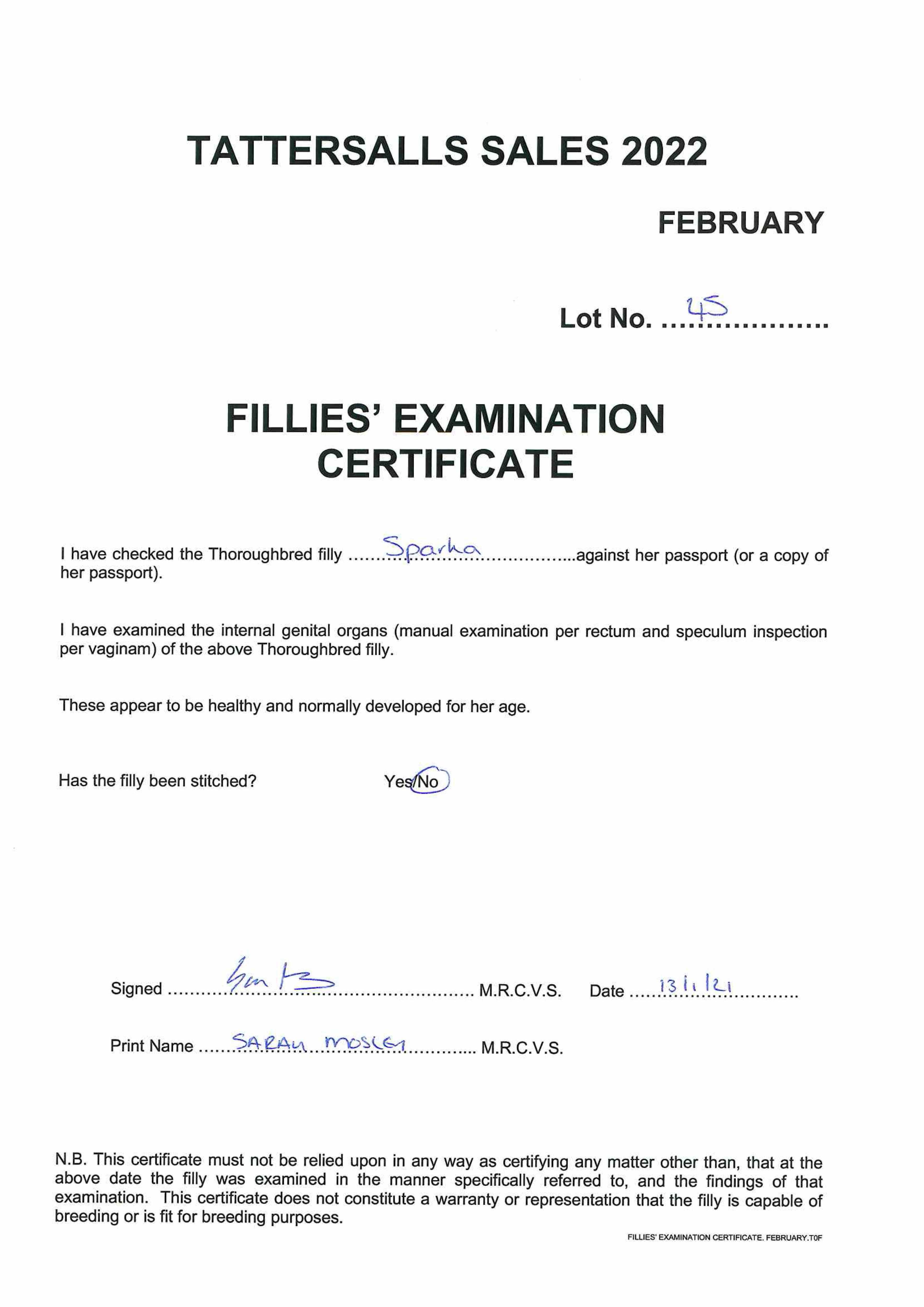 Fillies Examination Cert