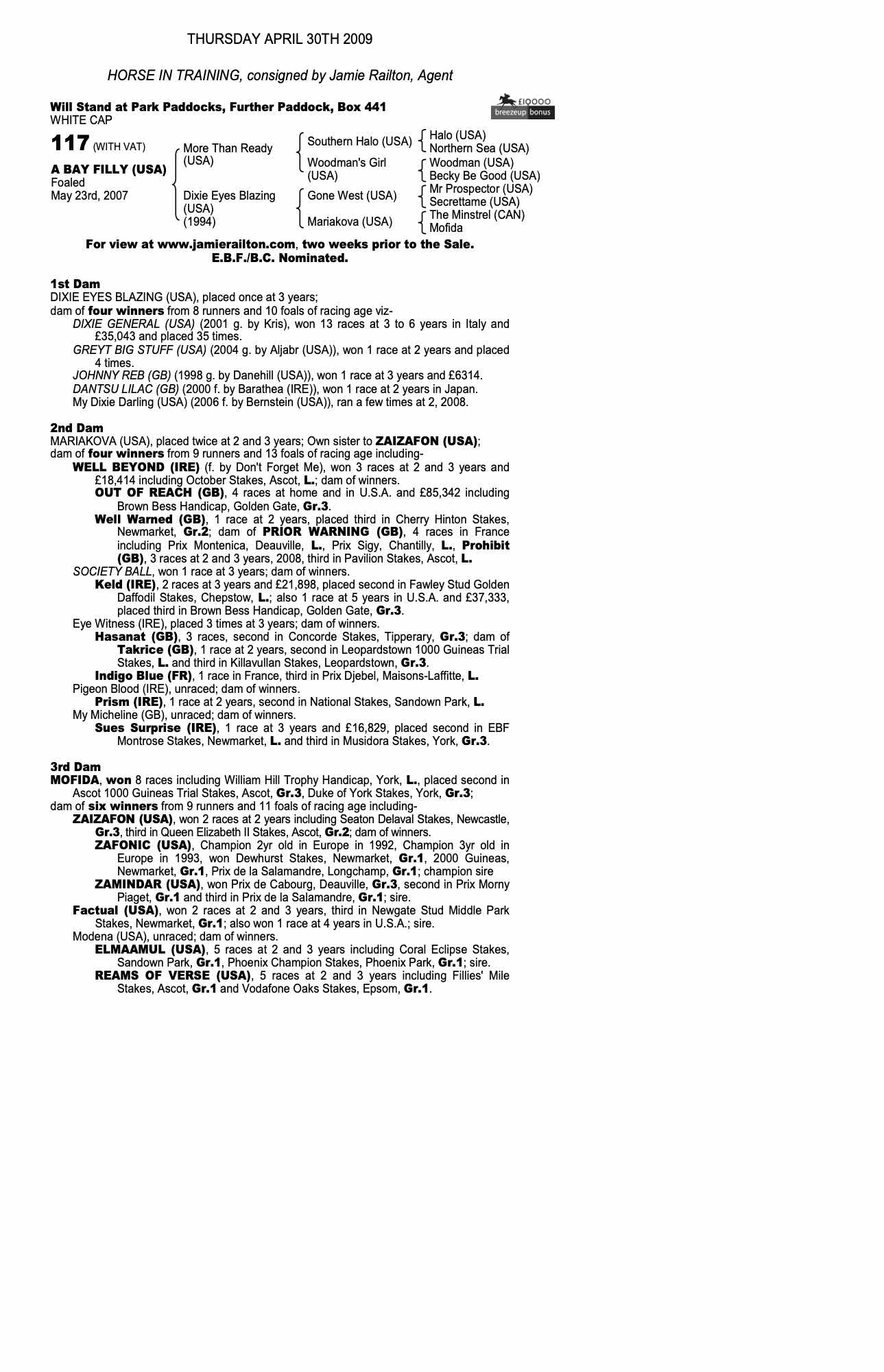 October Yearling Sale, Book 1 2003 lot 186 F. by Bahri (USA) 2002, Jamie Railton, Agent=>Gainsborough Stud Management 75,000 gns