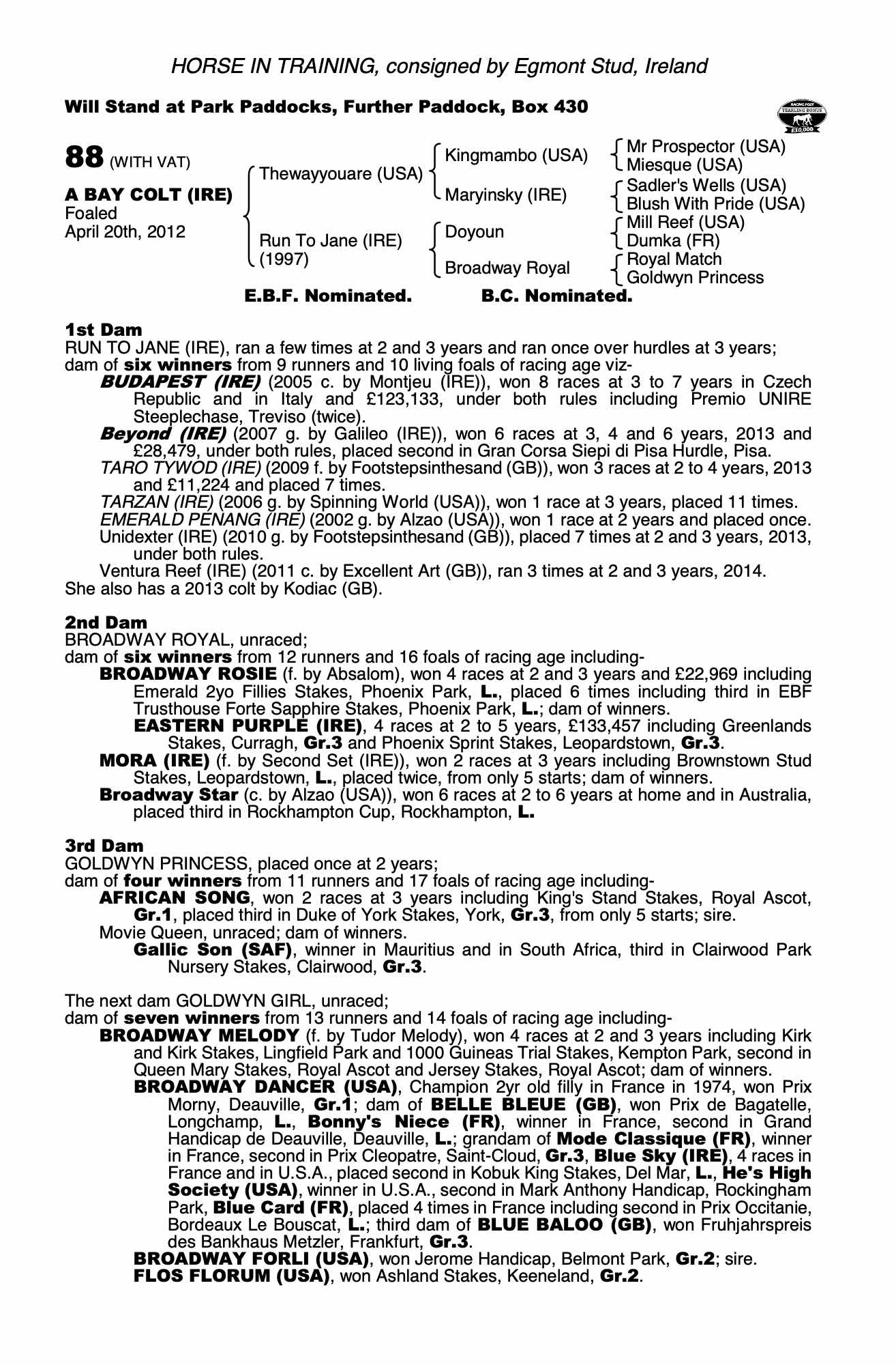 Consignor: Egmont Stud, Ireland