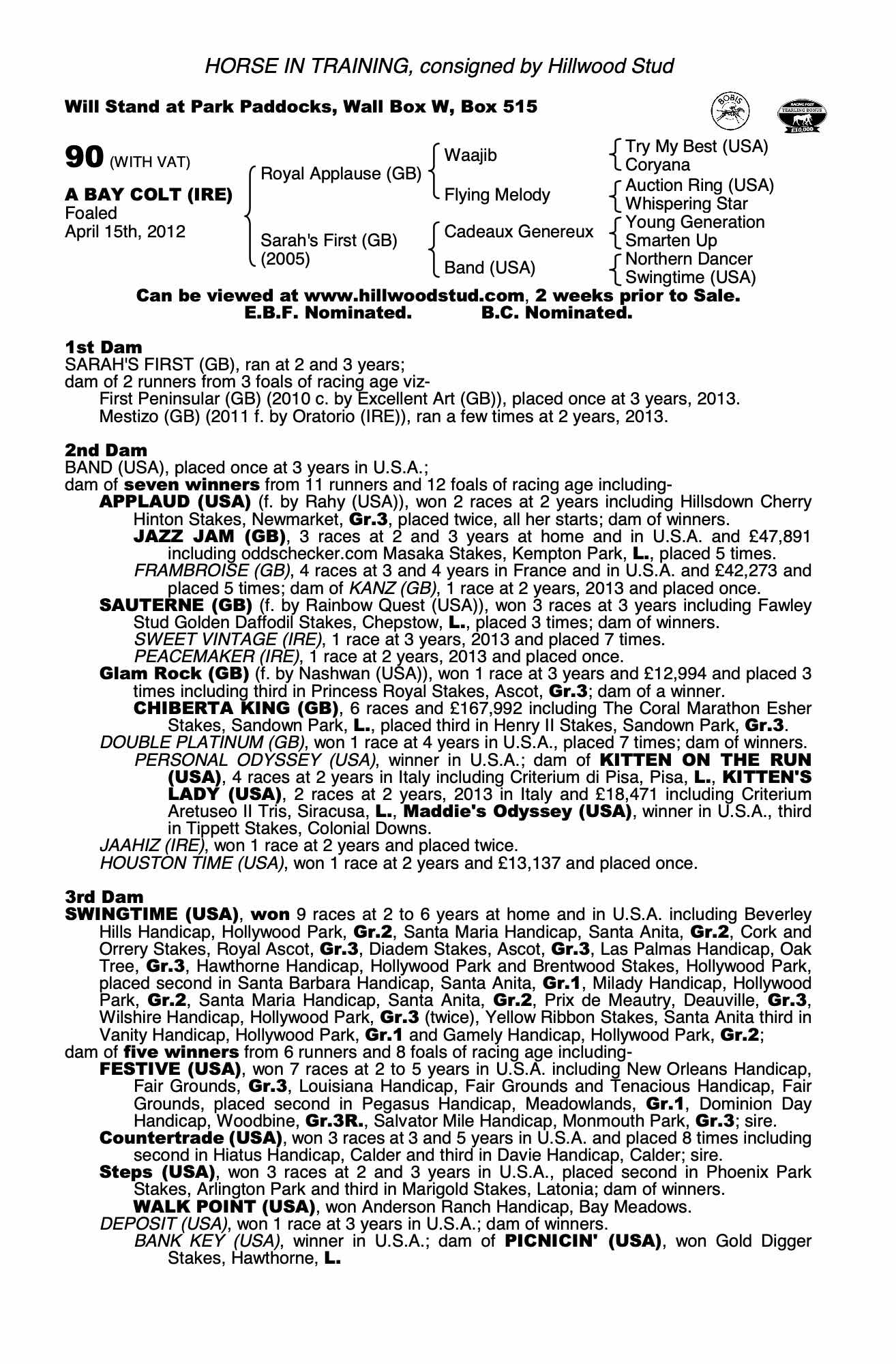 October Yearling Sale, Book 3 2012 lot 1711 F. by Oratorio (IRE) 2011, Jamie Railton, Agent=>Vendor 9,000 gns