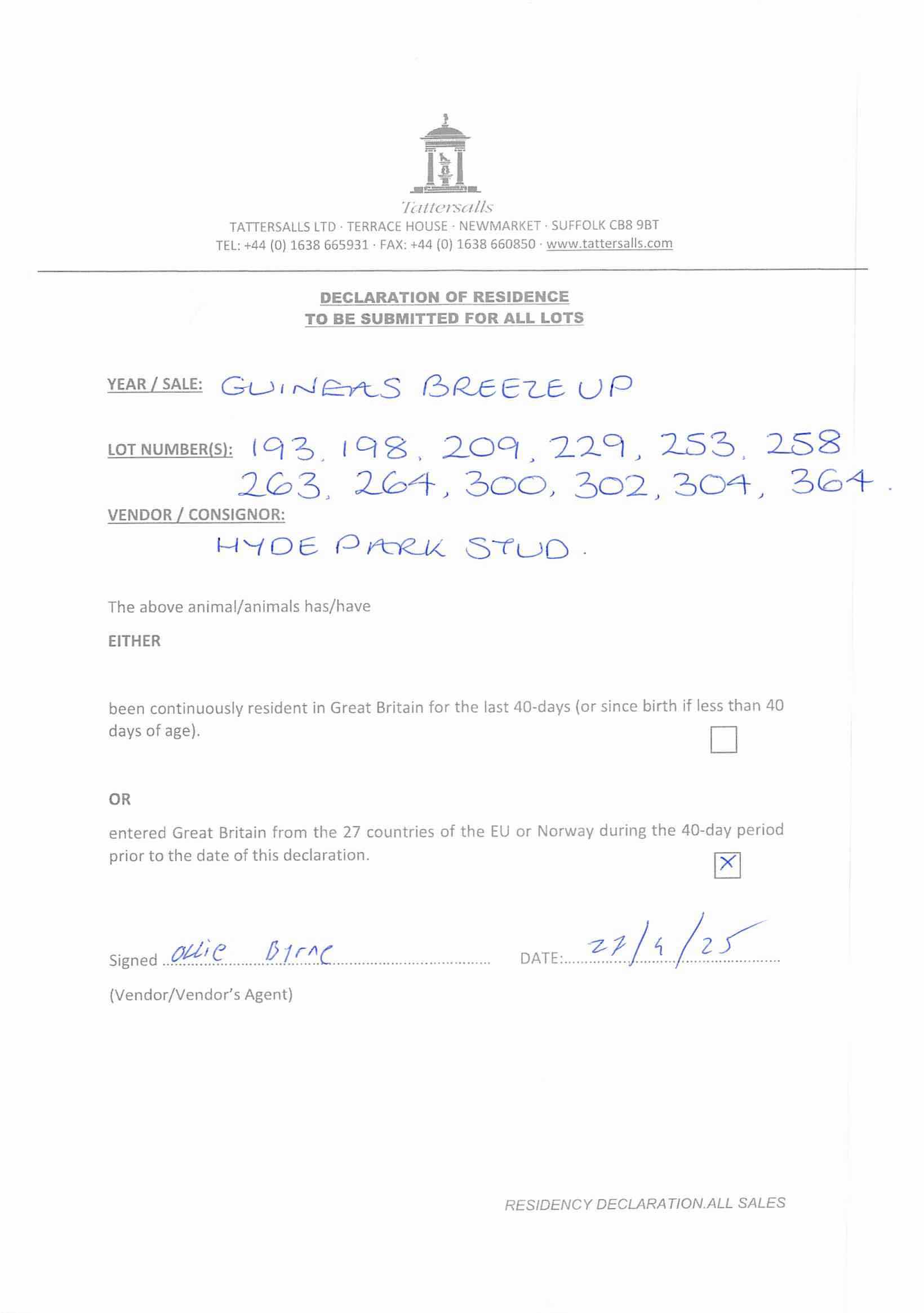 Consignor: Hyde Park Stud, Ireland