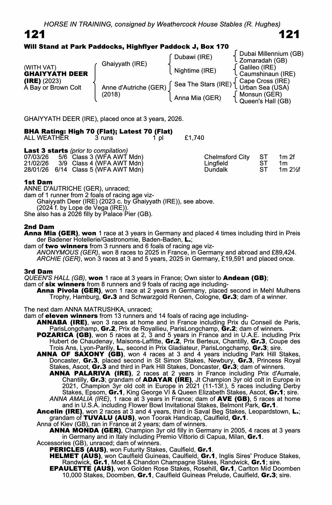 First foal: dam unraced out of unraced daughter of champion German filly Anna Paola: modest form: 6/1, 7 lengths fifth of 6 to Bay of Myths in maiden at Chelmsford last time: left D. K. Weld after first (2026) start: bred to stay 1½m.