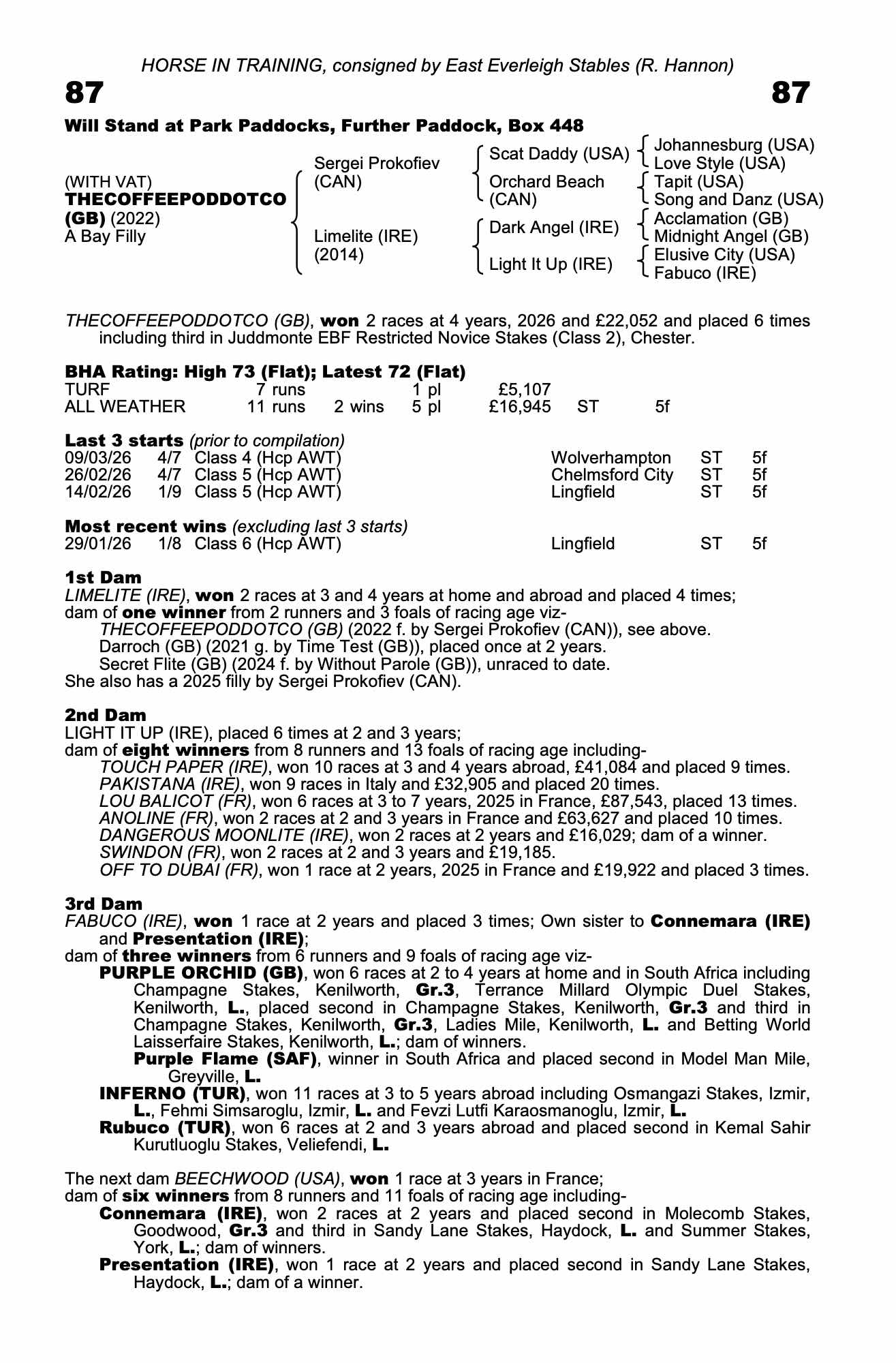| Mar 25 | Lin | 72 | 5/2f | 3-7 | 0 | Joe Leavy | a6g | 79 | 81 | ||
