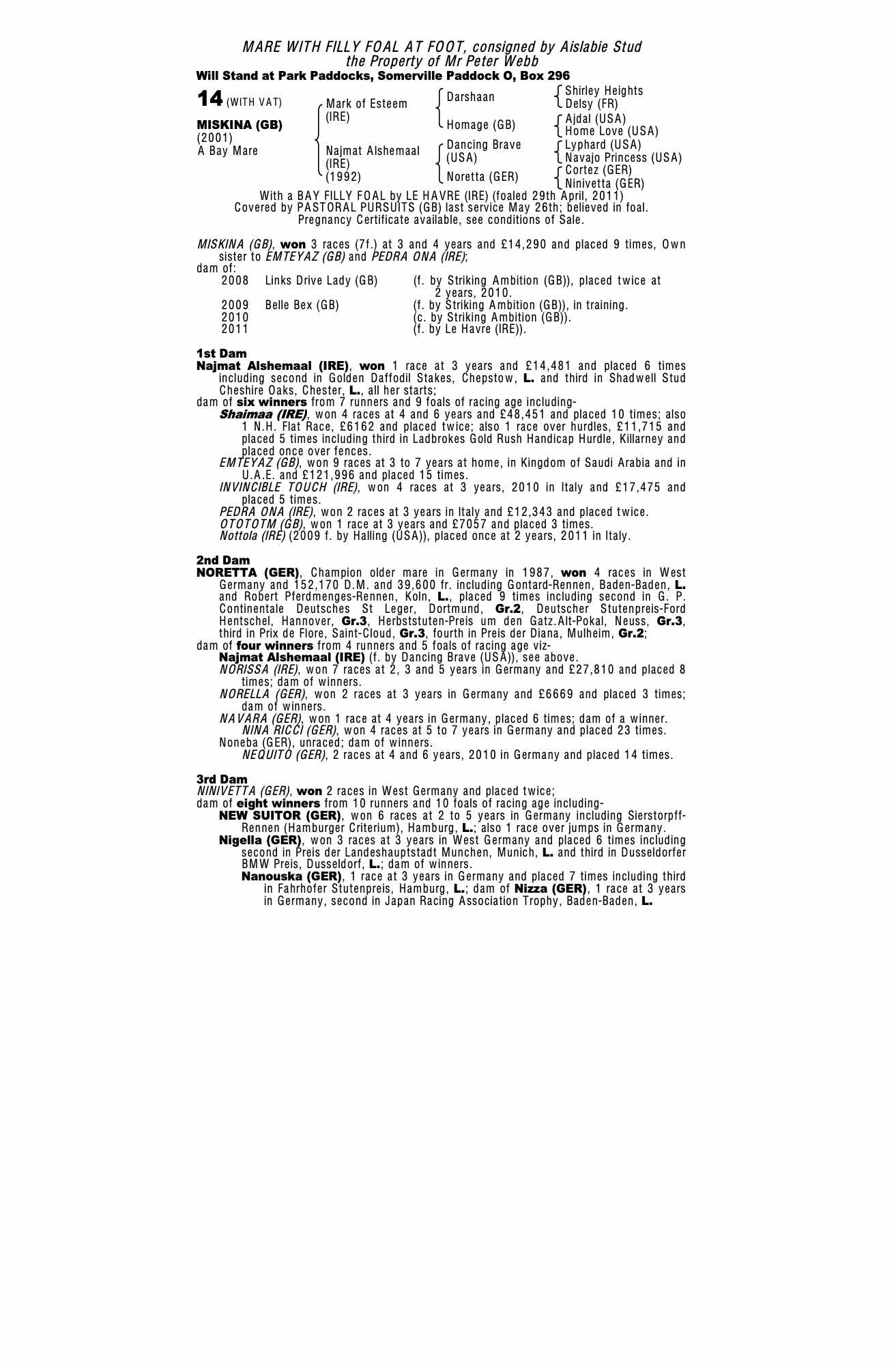 December Mare Sale 2014 lot 2434 Links Drive Lady (GB) (M. by Striking Ambition (GB)), Harper Lodge Stables (D. Ivory)=>Lot Not Sold 24,000 gns