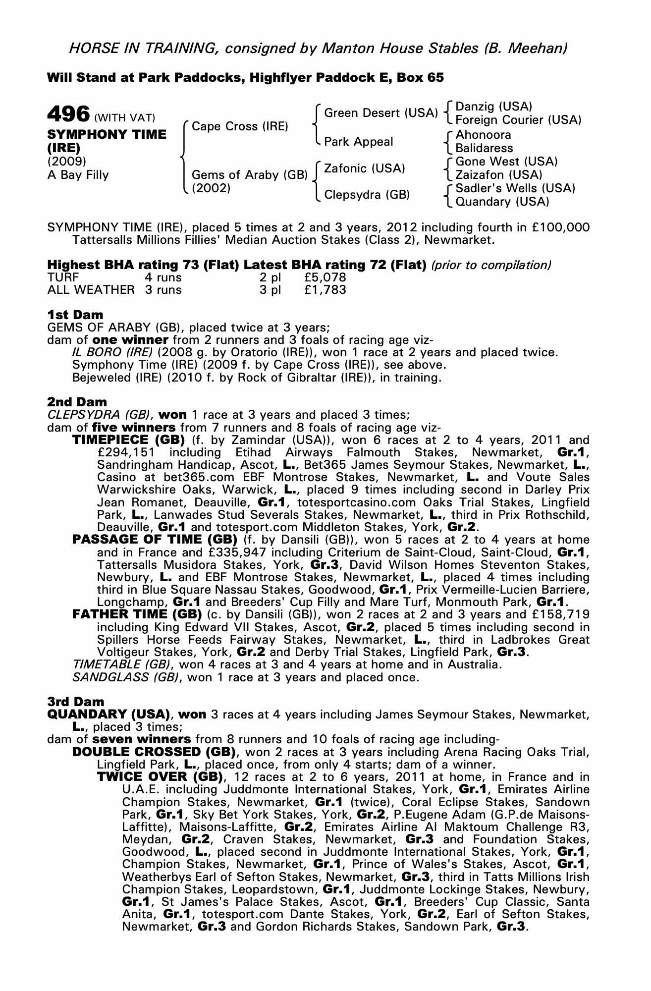 October Yearling Sale, Book 2 2011 lot 677 F. by Rock of Gibraltar (IRE) 2010, Hillwood Stud=>Henry Cecil 65,000 gns