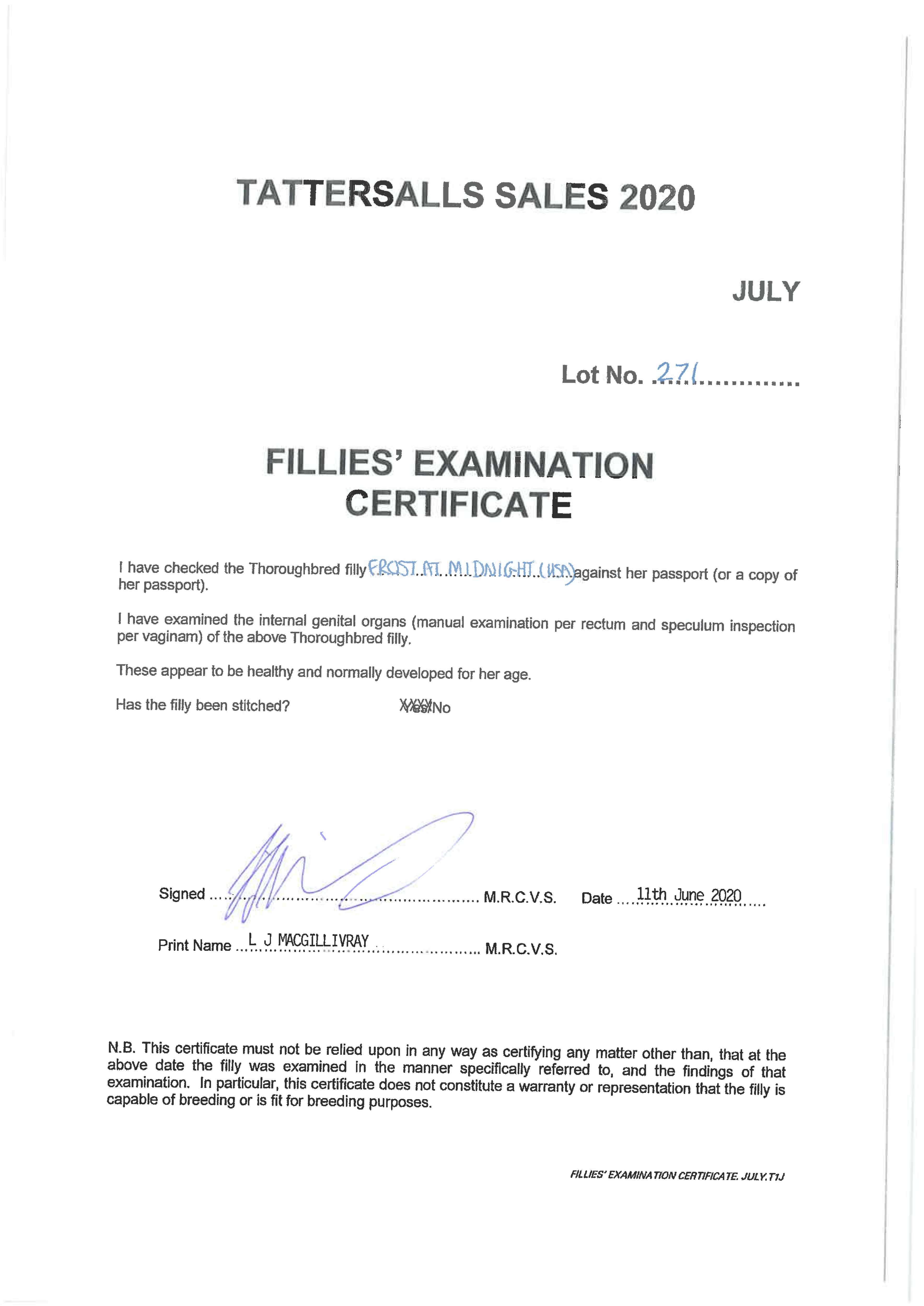Fillies Examination Cert