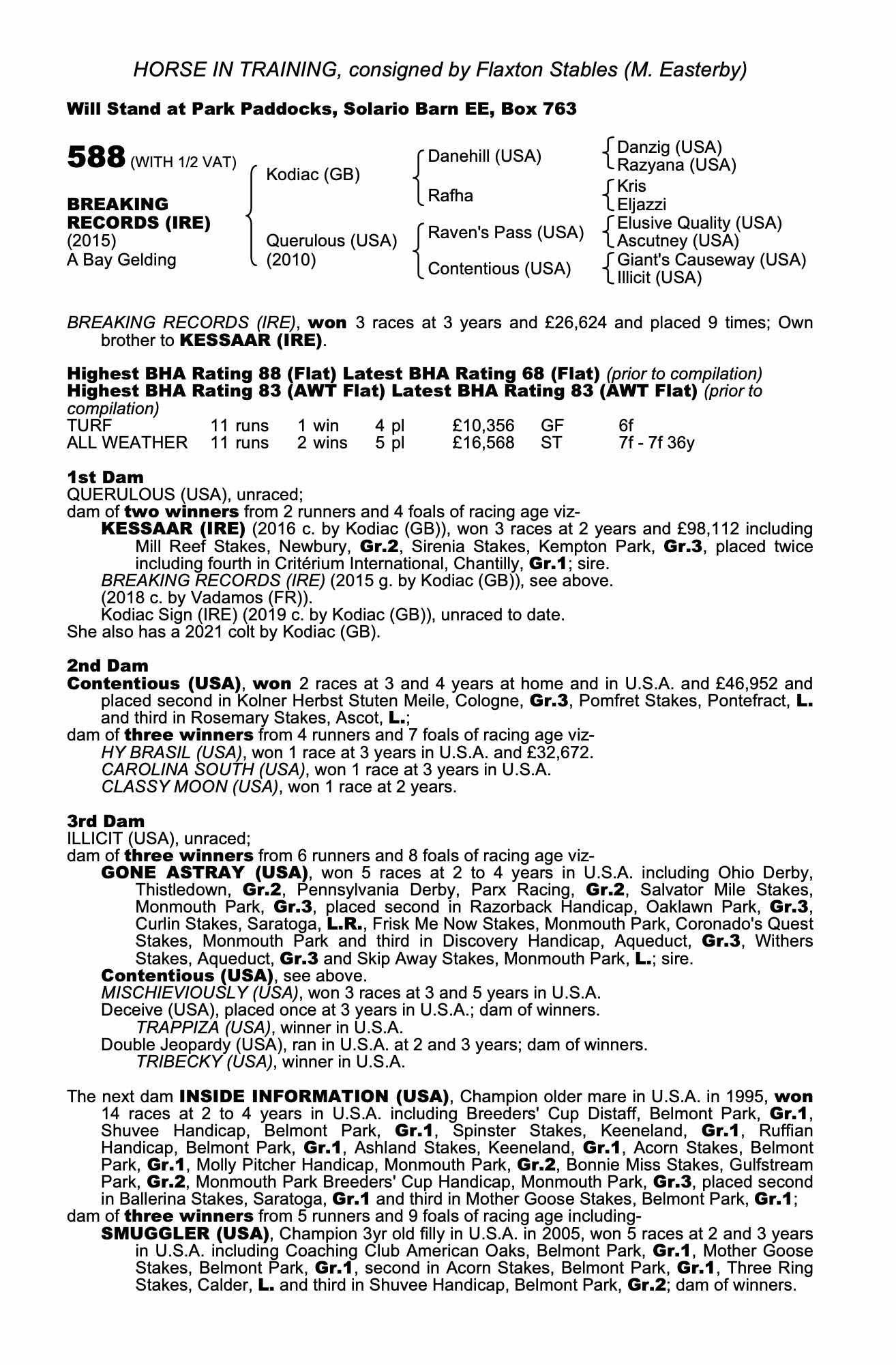 Online Charity Auction of Stallion Nominations lot 27 A Nomination to Kessaar (IRE) (H.), =>Bidding Closed £3,600