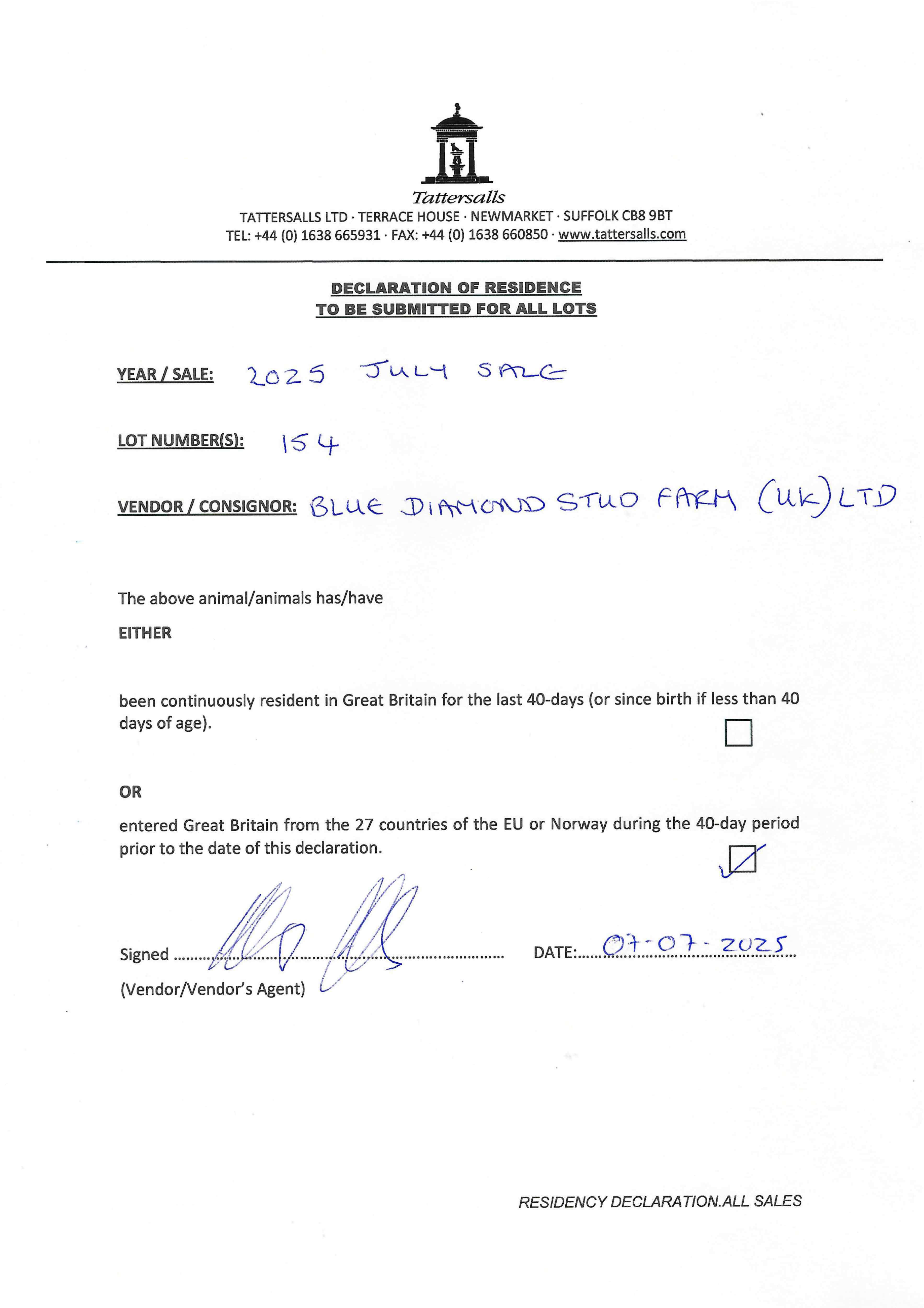 Consignor: Blue Diamond Stud Farm (UK) Ltd.