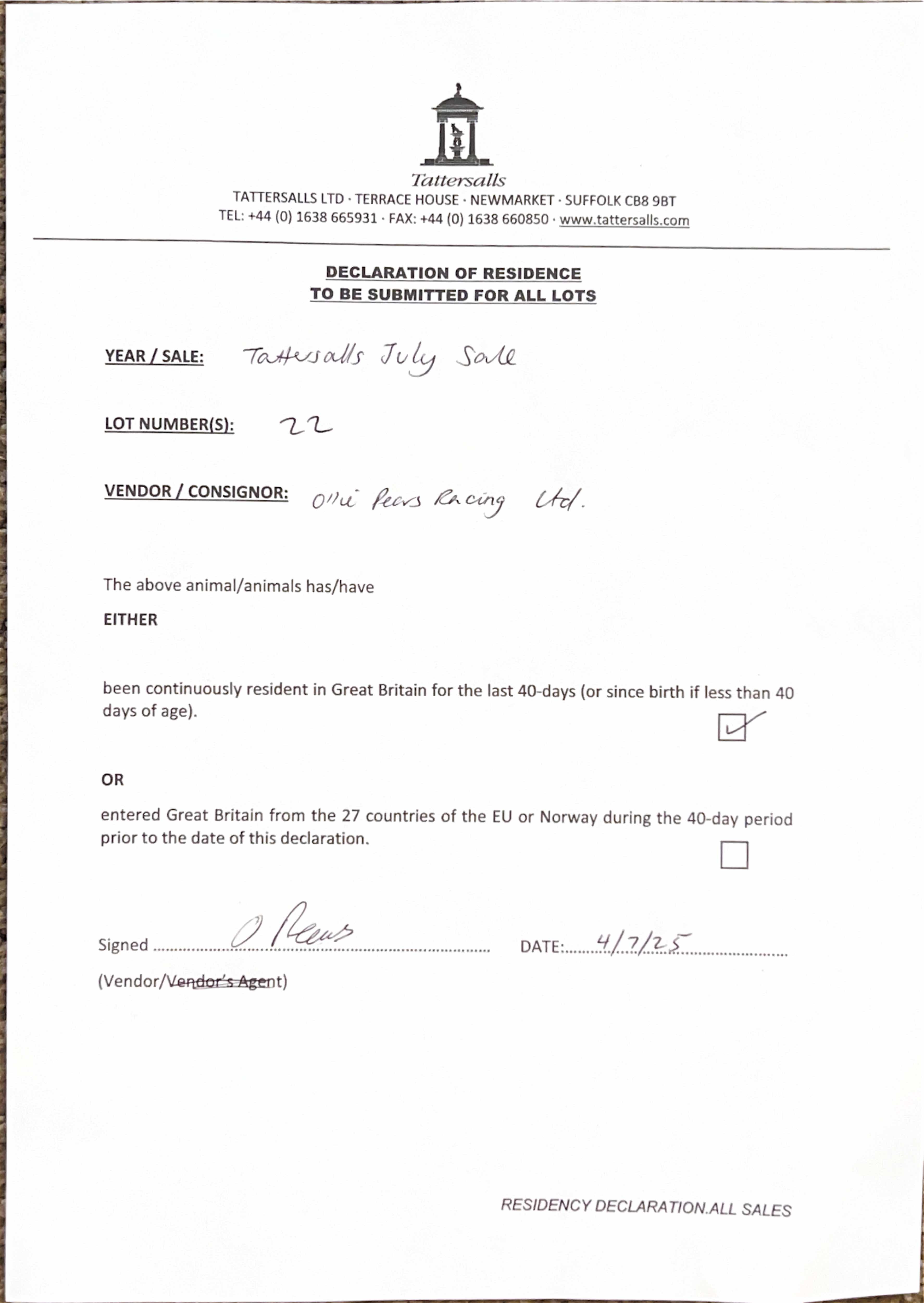 Consignor: Jamie Railton (Agent)