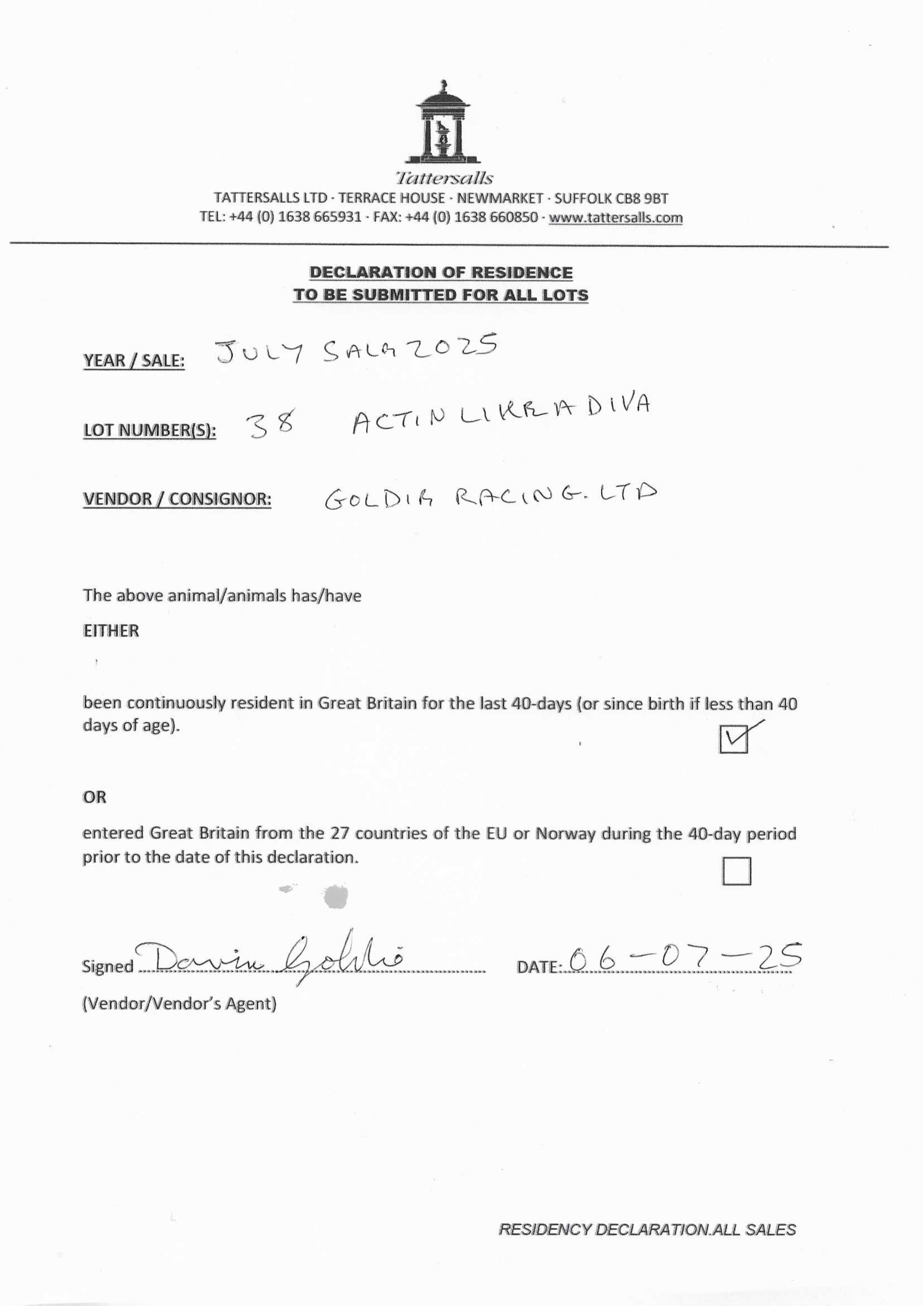 Consignor: Goldie Racing Ltd.