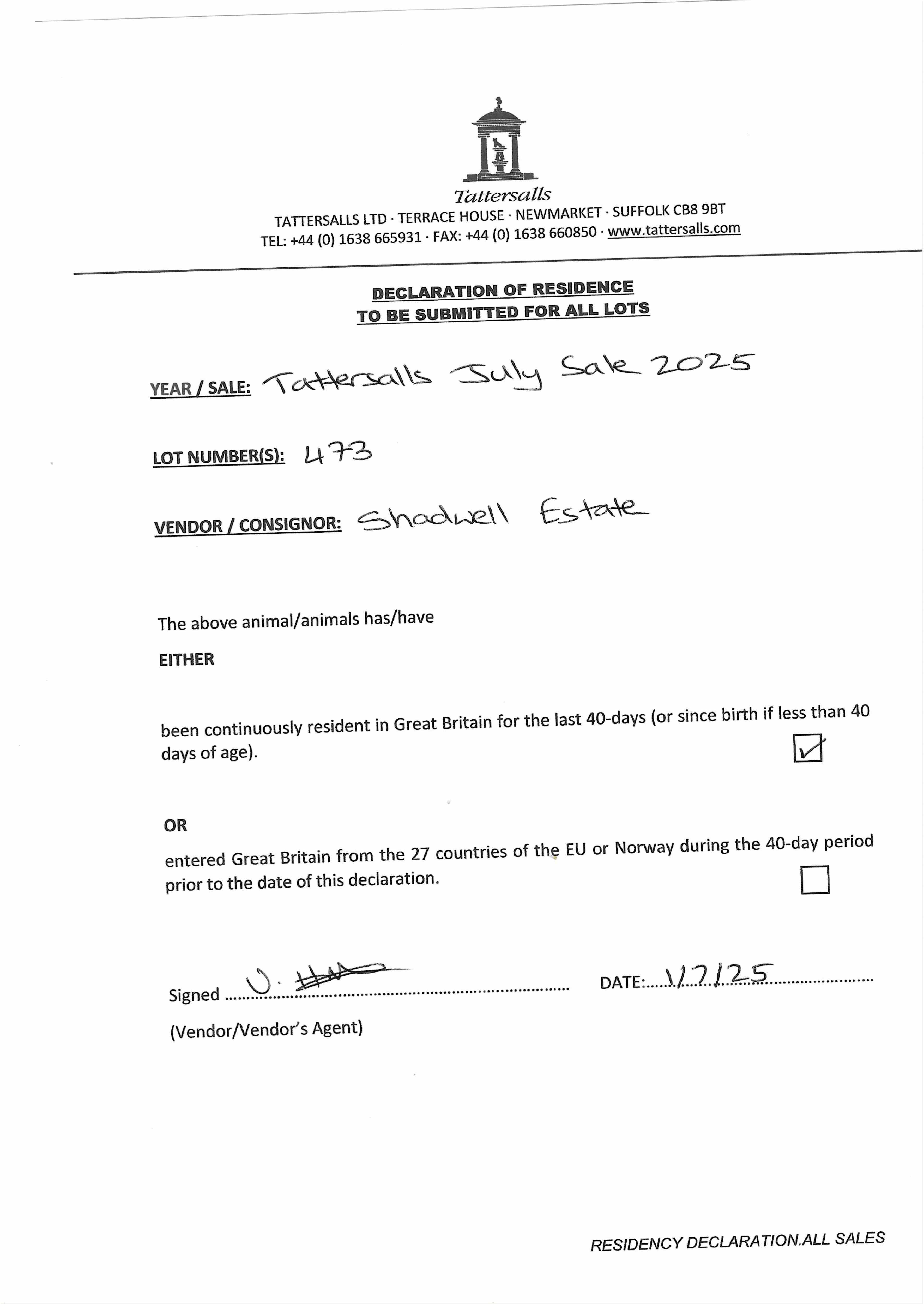 Consignor: Shadwell Estate Company Ltd.