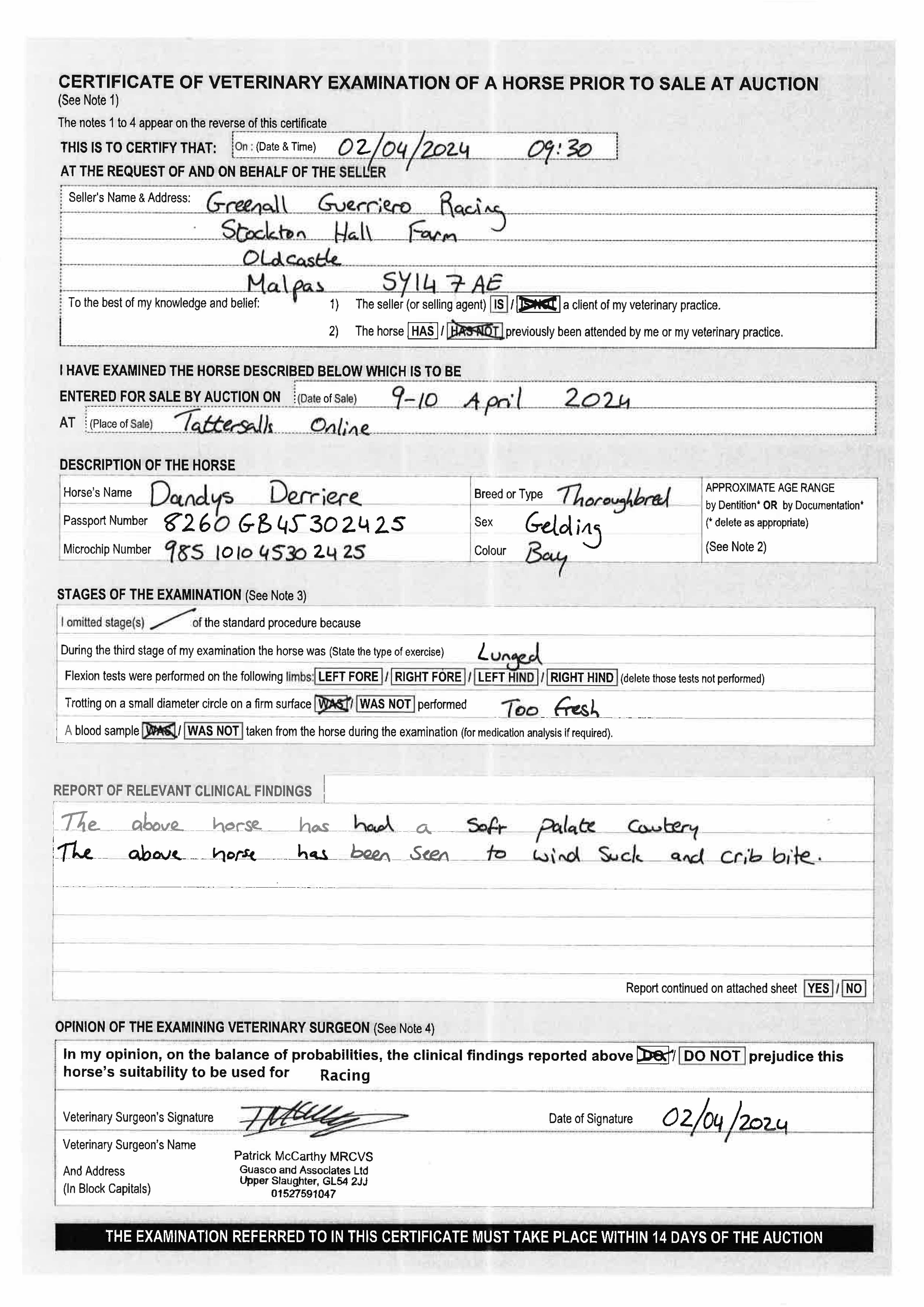 Vices/Declarations: Has been seen to Crib-Bite and Wind-Suck. Has had a soft palate operation.