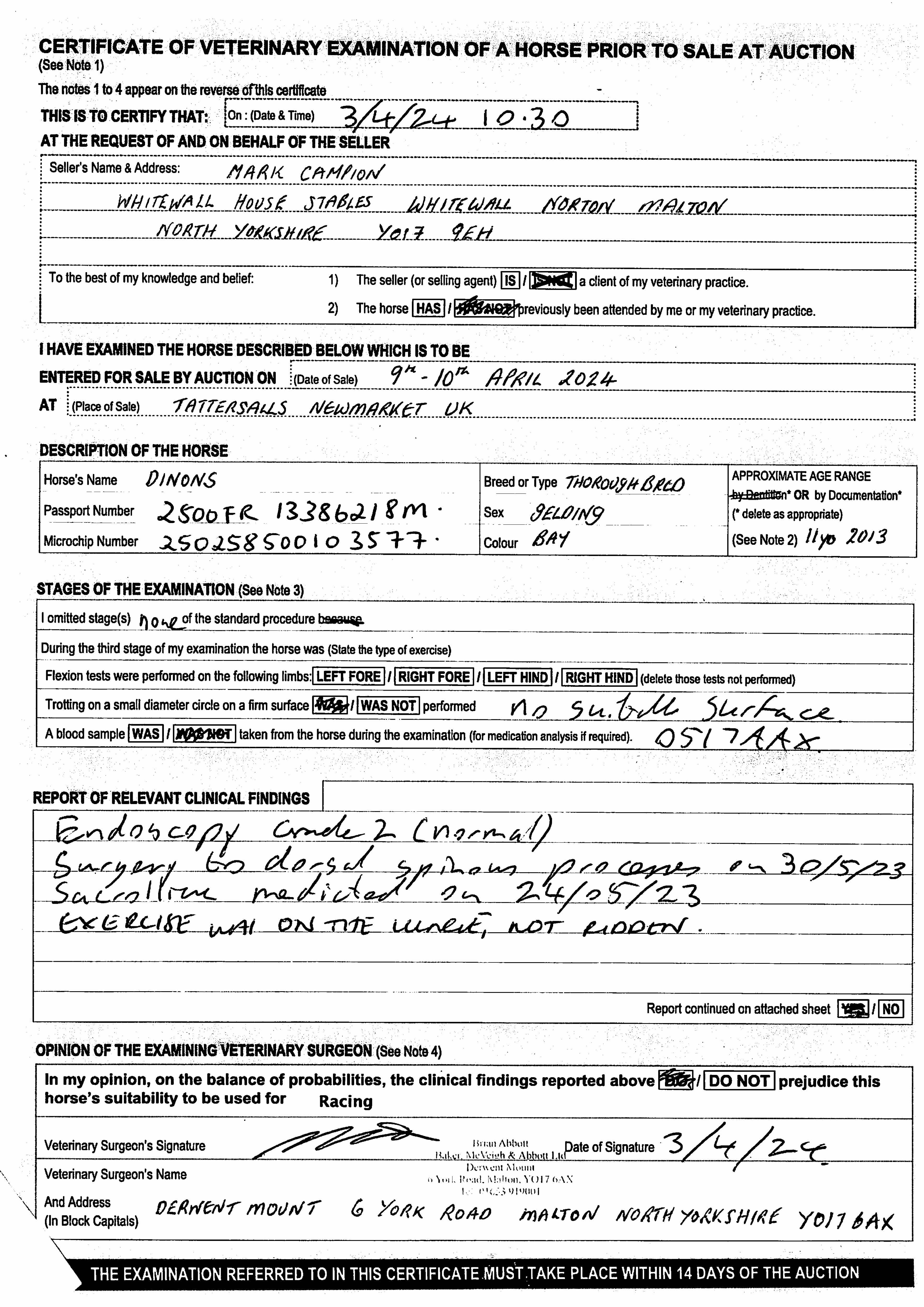 Vendor's Notes: Tough, fine, good-looking gelding who is 100% sound. After an unlucky first run for me when he was badly hampered he has improved every time since and won comfotably at Hexham over fences when last seen. We feel he is very well handicapped. He appreciates better ground and has plenty of miles left in him. Received procedure to rectify a kissing spine in summer 2023 which was a success and he moves markedly better since.