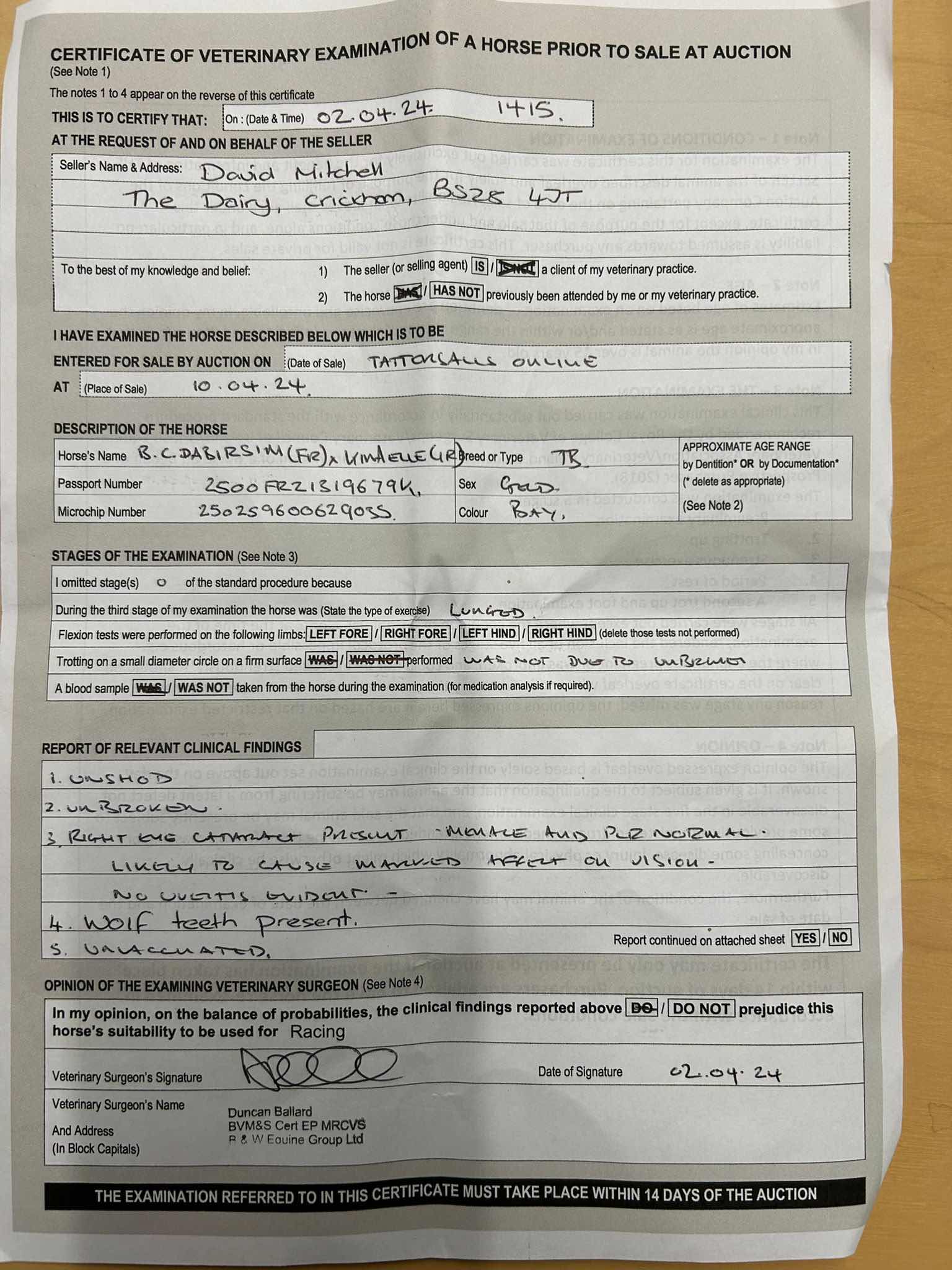 Monday 8 April:  This lot is not vaccinated in accordance with the current BHA influenza requirements and further vaccinations will be required before it can enter a UK racecourse.