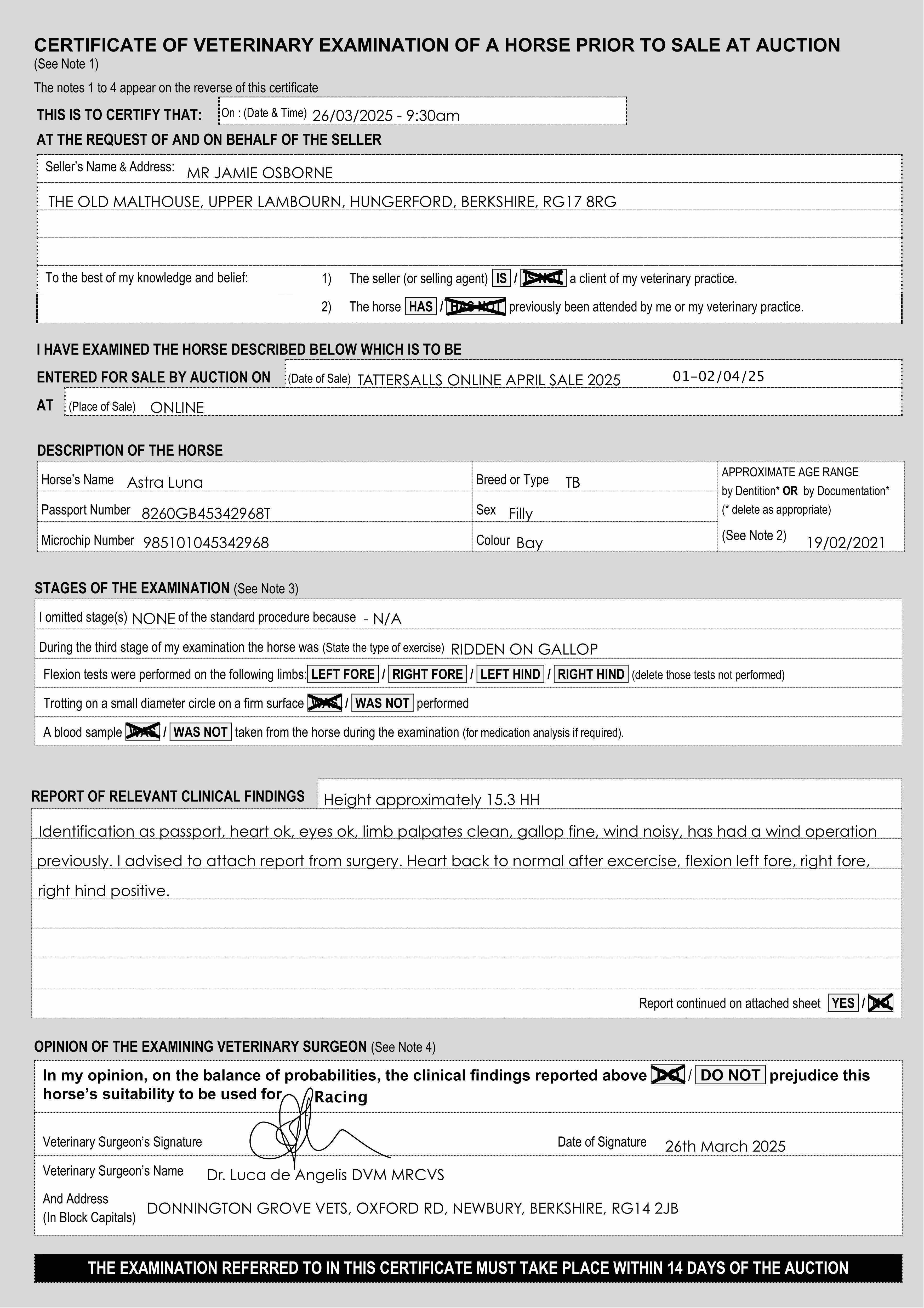 Vices/Declarations: Has been heard to make a noise. Has had a soft palate operation.