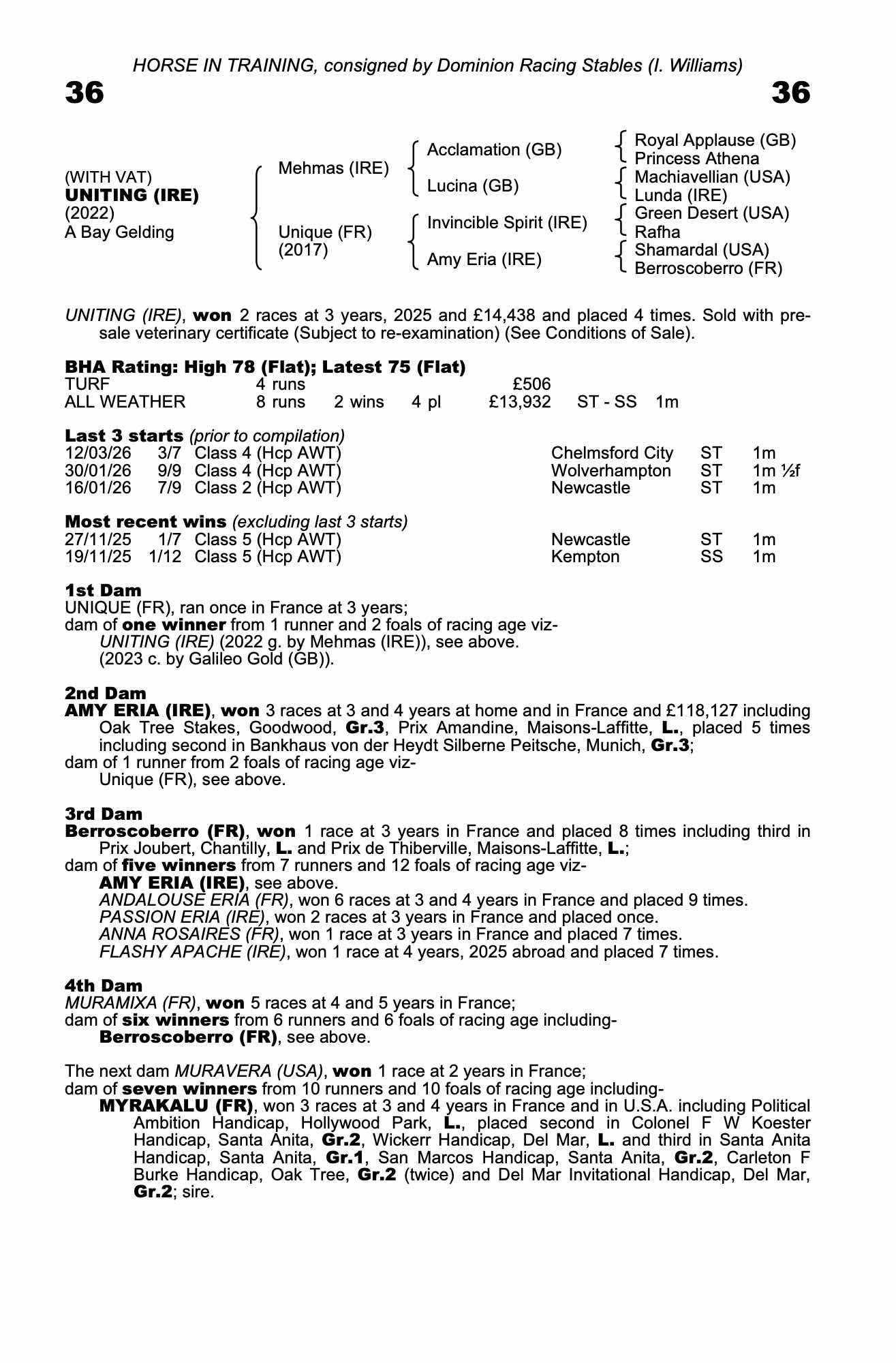 Online Sale - 19th March 2026 lot 45, Dominion Racing Stables (I. Williams)=>Vendor 19,500 gns