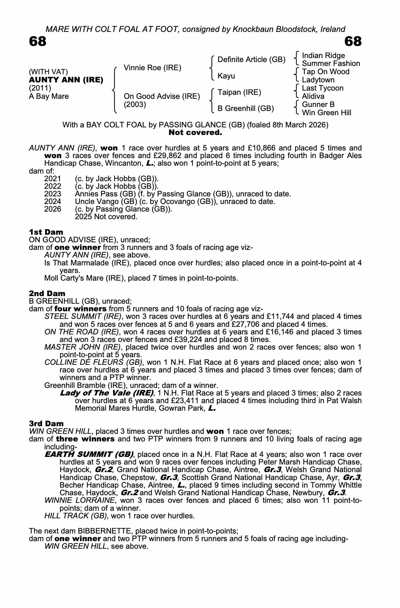 Vendor's Notes: A good looking, correct mare who was a tough sound racehorse. A winner of five races and fourth in the listed Badgers chase. She has a very nice, strong colt foal at foot by grade one producing sire Passing Glance. There is a three year old full sibling that has been retained, and is due to go into training with Emma Lavelle.