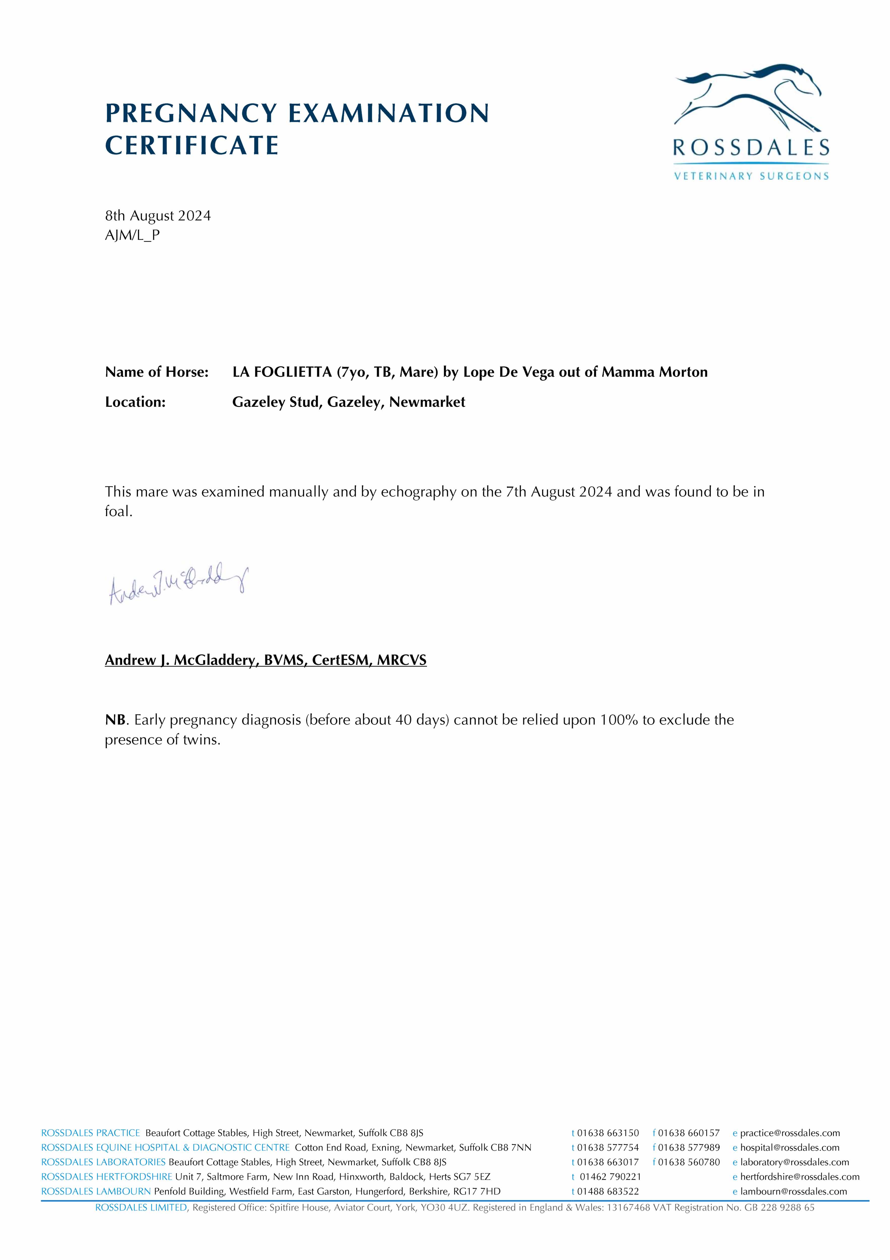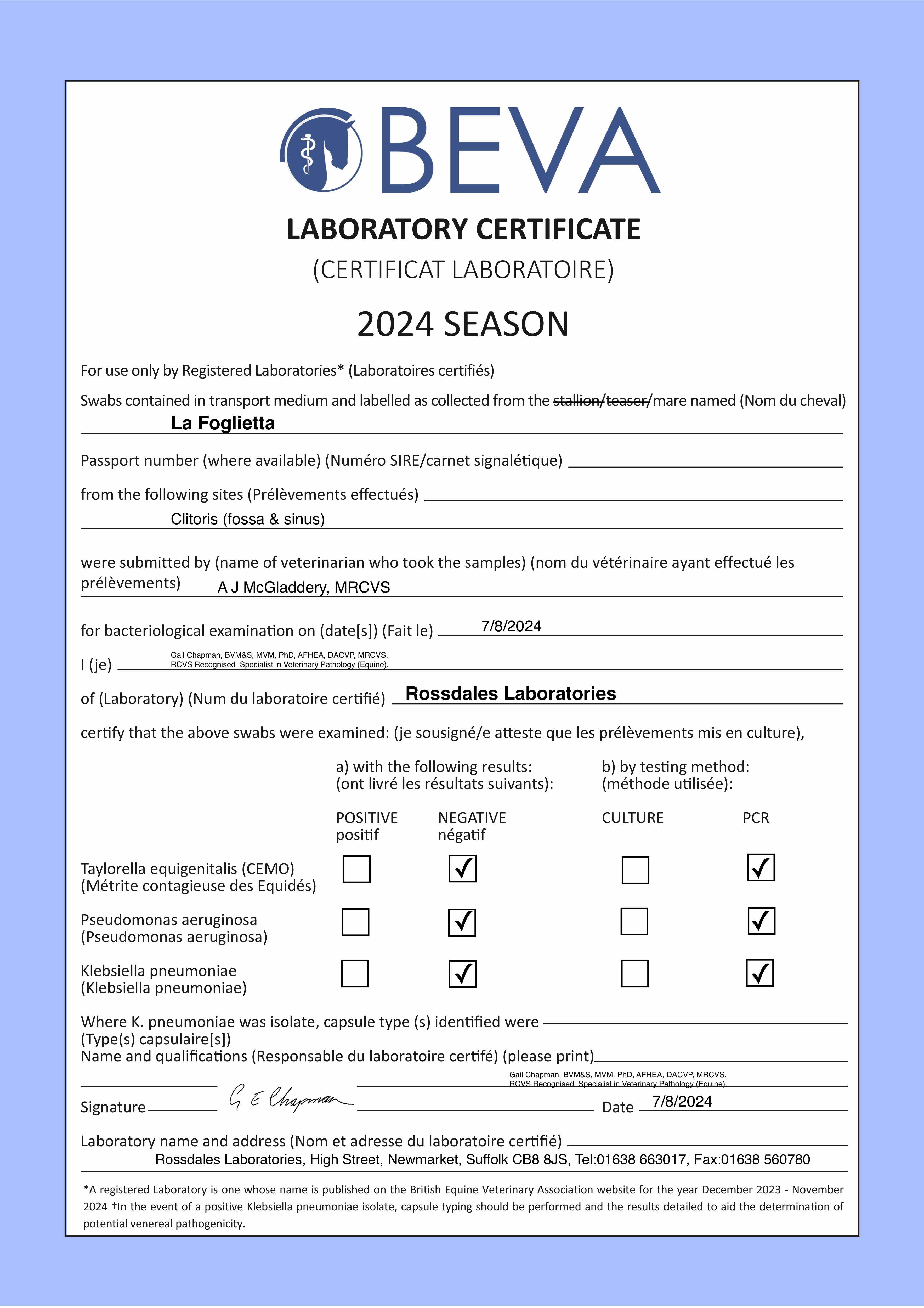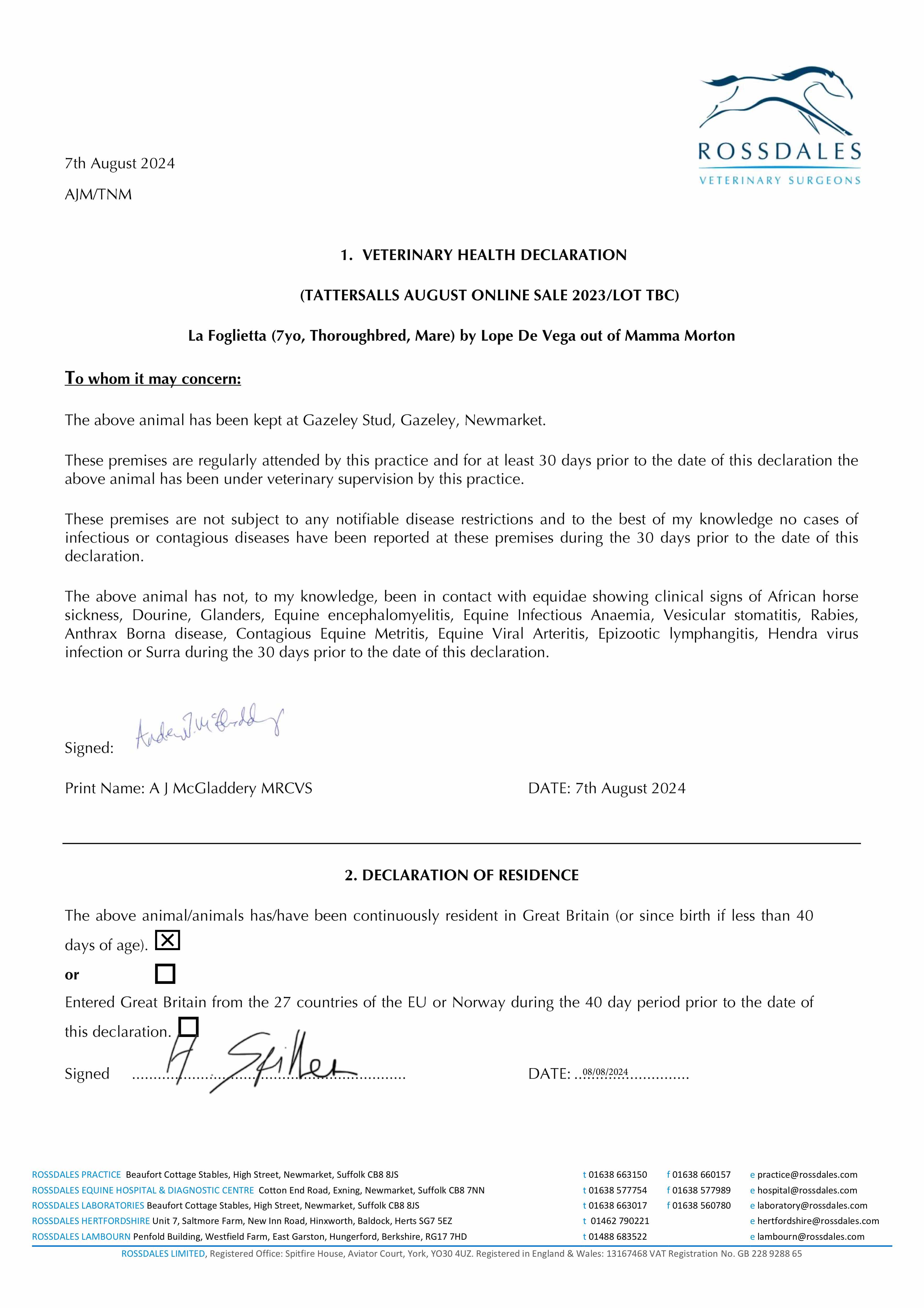Vices/Declarations: Covering Certificate Lodged with Tattersalls