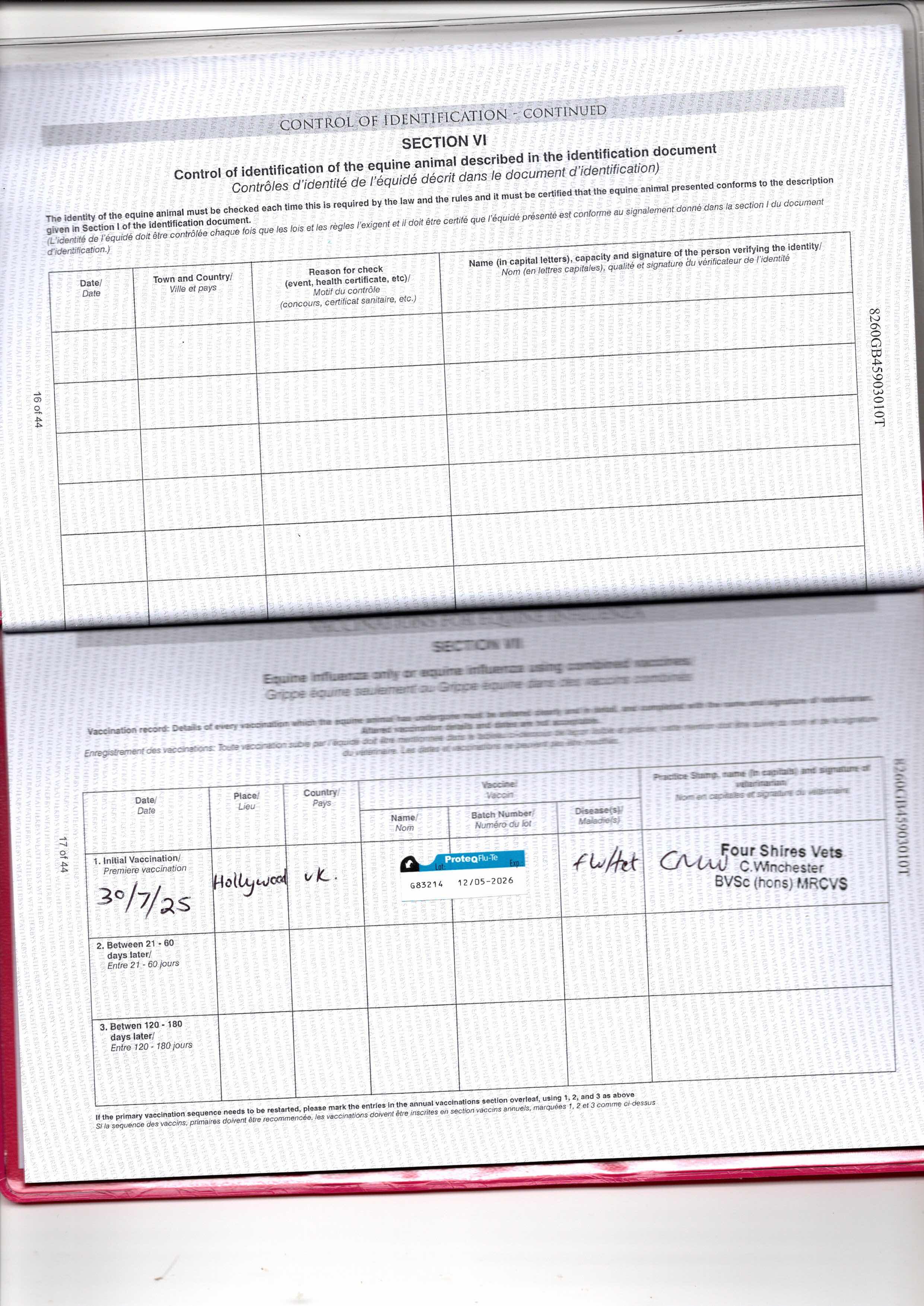 Vices/Declarations: The influenza vaccinations are not compliant with the current BHA requirements and further vaccinations will be required. No valid EIA Coggins received.
