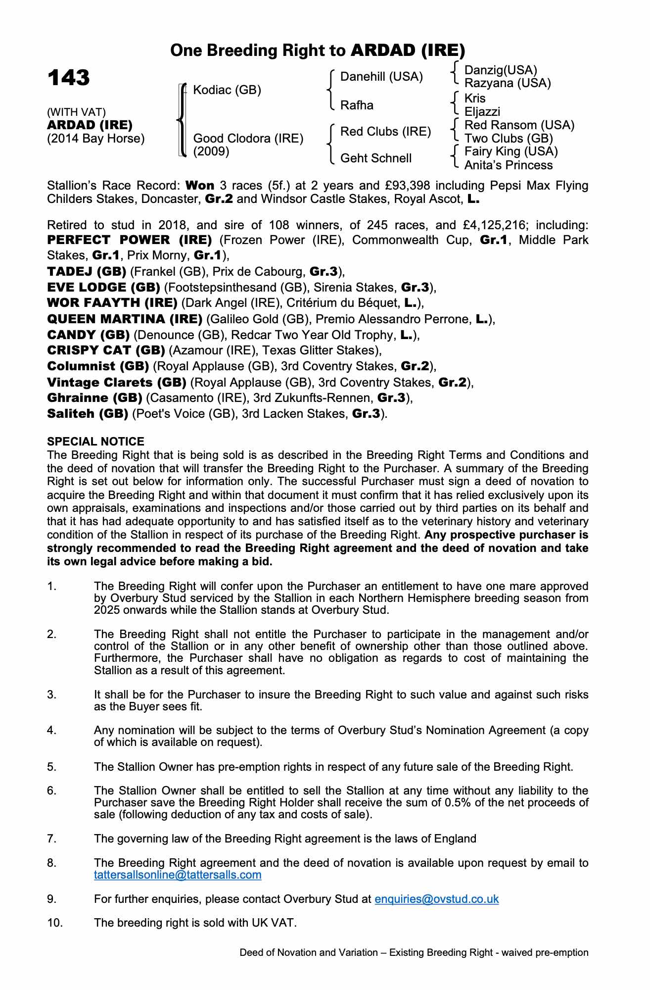 Vendor's Notes: The Breeding Right agreement and the deed of novation is available upon request by email to tattersallsonline@tattersalls.com