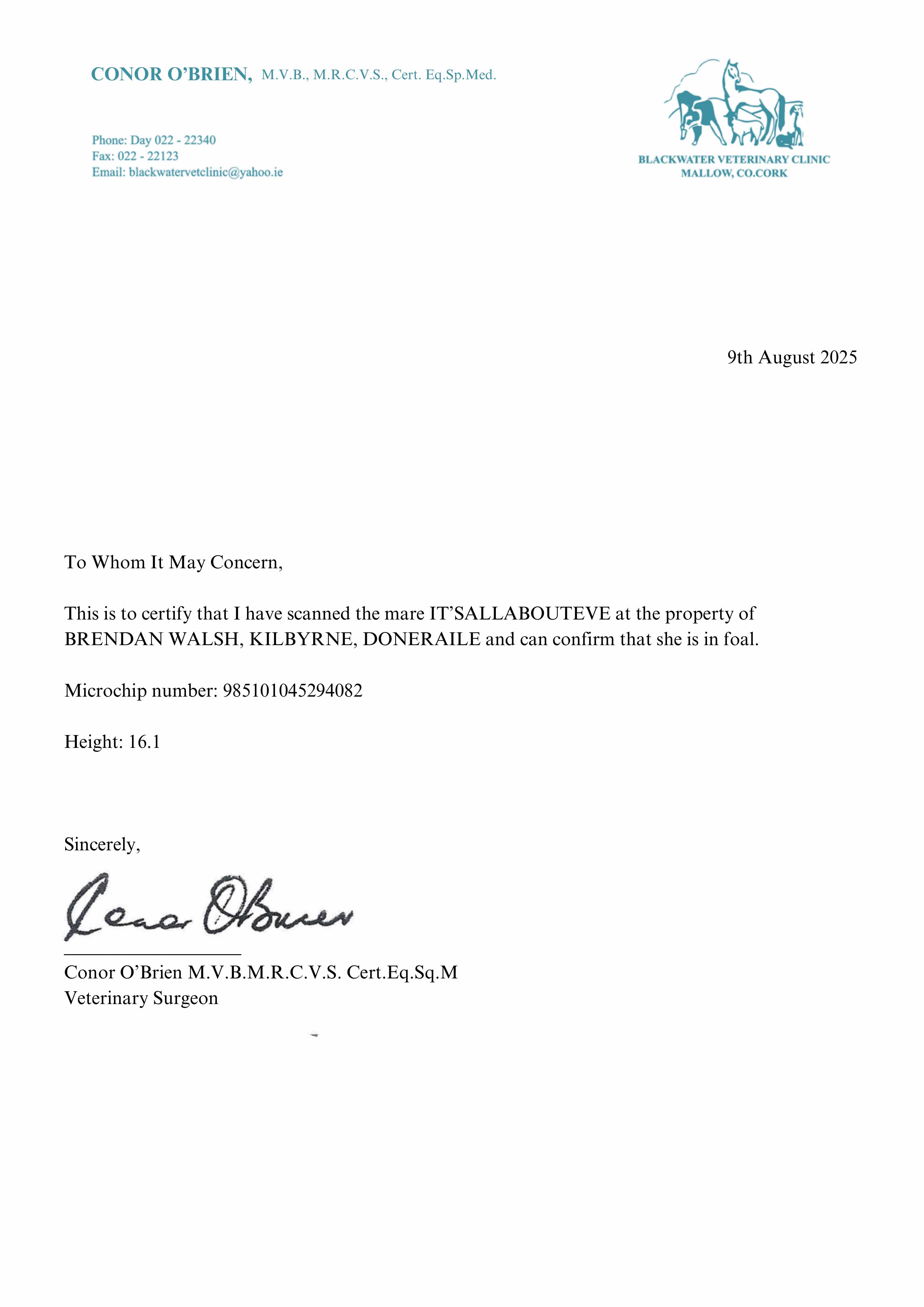 Contact: Brendan Walsh  ✆ 00353862665043  ✉ walshbrendan11@gmail.com