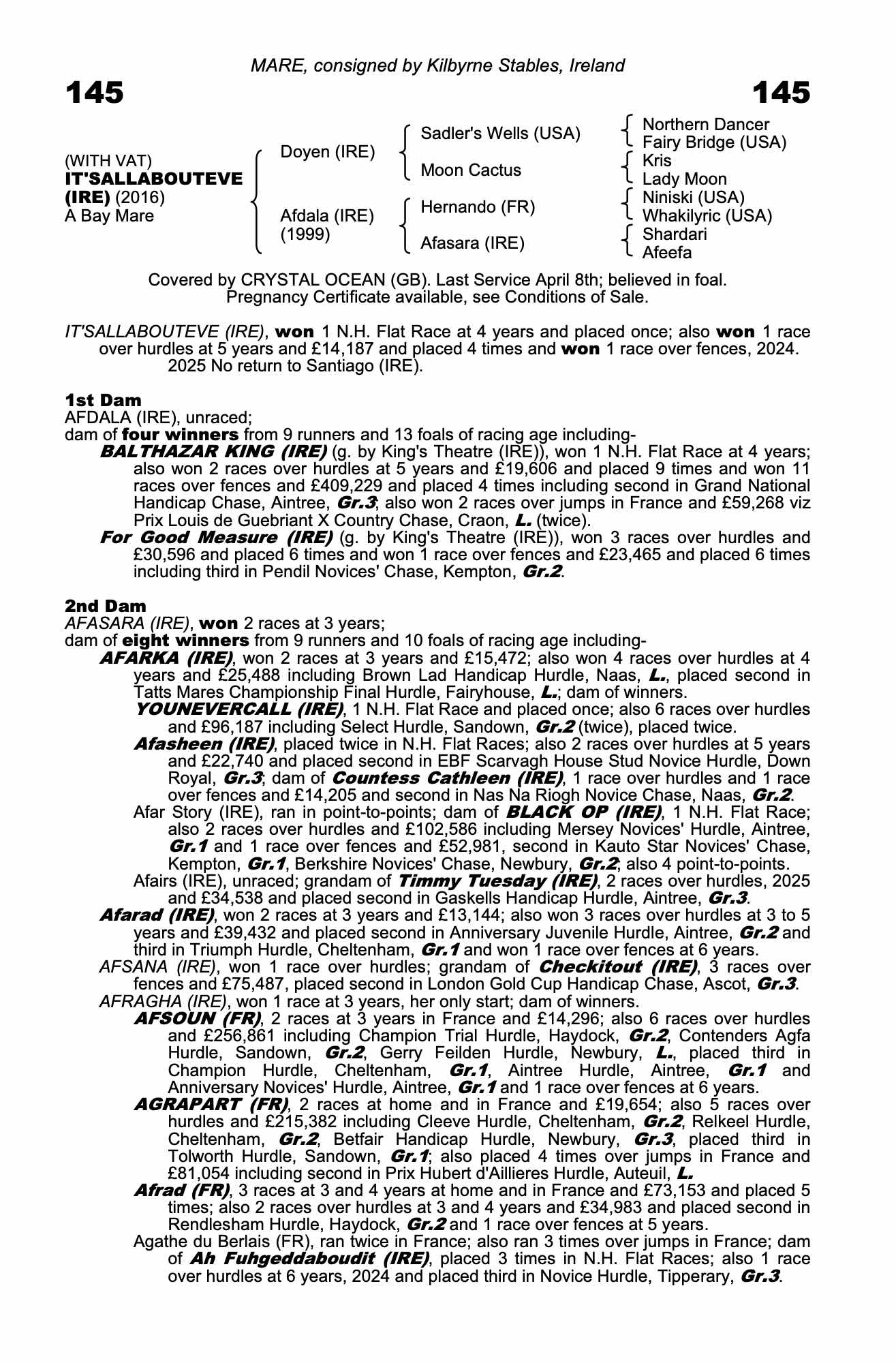 Vendor's Notes: Its’allabouteve is a very good looking scopey mare by Grade 1 sire Doyen. She herself is the winner of a bumper on her first start at 4, a winner over hurdles and a winner over fences. A tough, versatile performer she is carrying on an early service to the world’s highest rated horse and most exciting young sire Crystal Ocean who has made such a good start at stud. She boasts an outstanding pedigree being a half-sister to BALTHAZAR KING and FOR GOOD MEASURE.