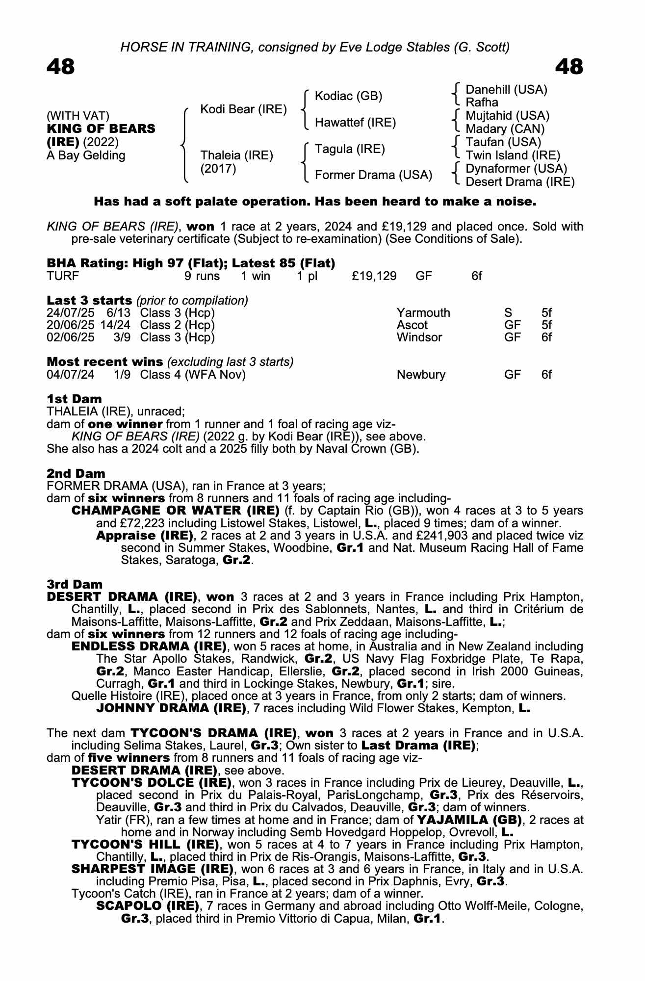 Vices/Declarations: Has been heard to make a noise. Has had a soft palate operation.