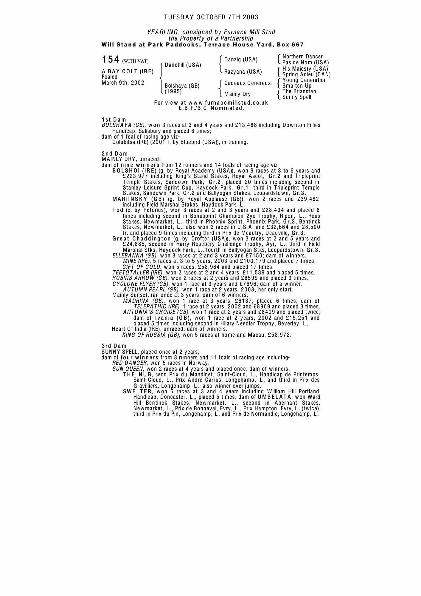 October Yearling Sale 2002 lot 201 F. by Bluebird (USA) 2001, Furnace Mill Stud=>Larry Stratton 58,000 gns