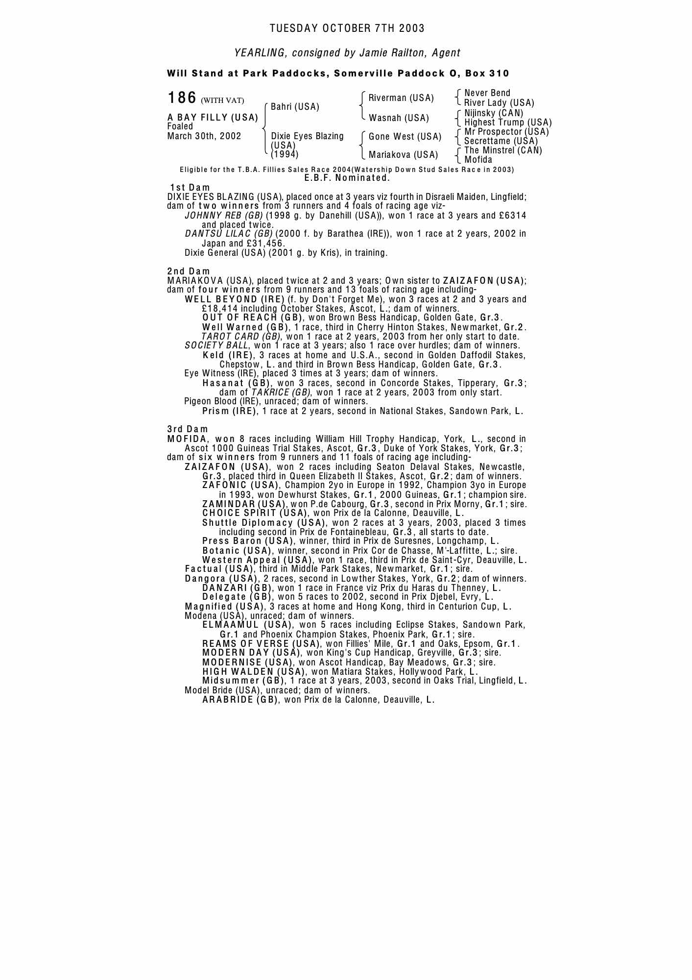 October Yearling Sale, Book 2 2006 lot 1311 F. by Stravinsky (USA) 2005, Jamie Railton, Agent=>Denis Coakley 13,000 gns