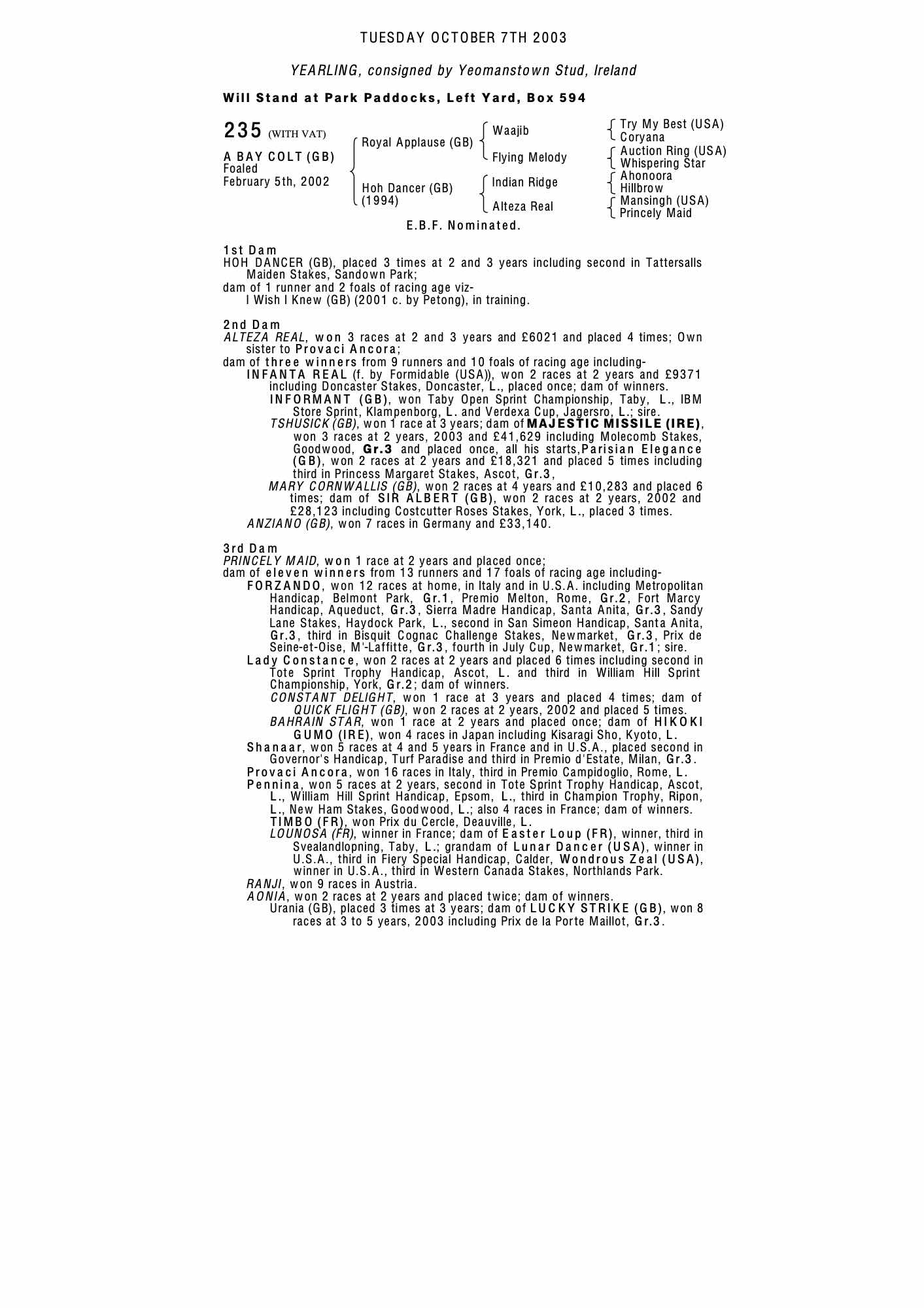 Autumn Horses in Training Sale 2002 lot 70 Pinjarra (GB) (F. by Petong), Eve Lodge Stables=>Mubarak Al-Sabah 800 gns