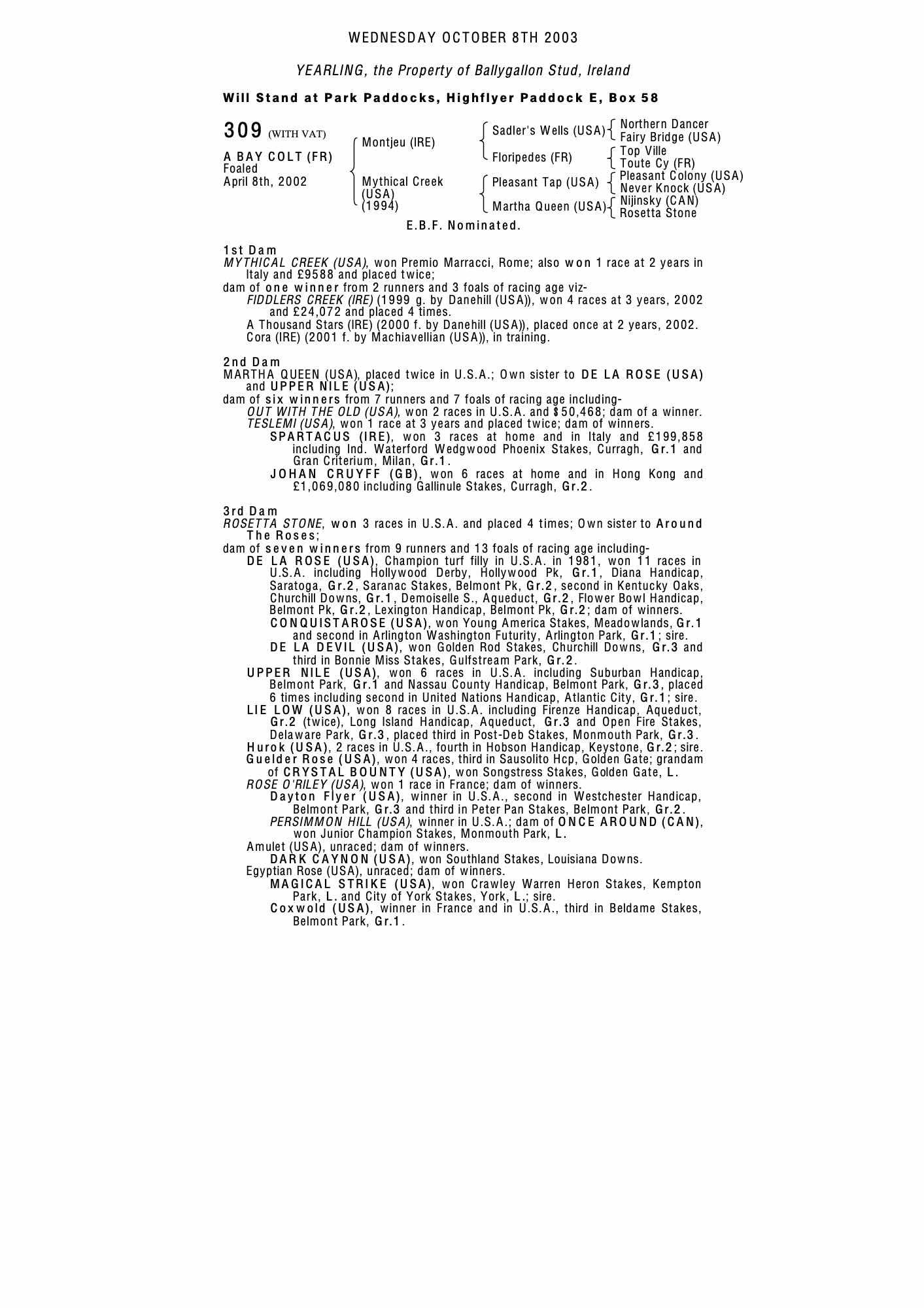 October Yearling Sale 2002 lot 59 F. by Machiavellian (USA) 2001, Ballygallon Stud, Ireland=>Vendor 45,000 gns