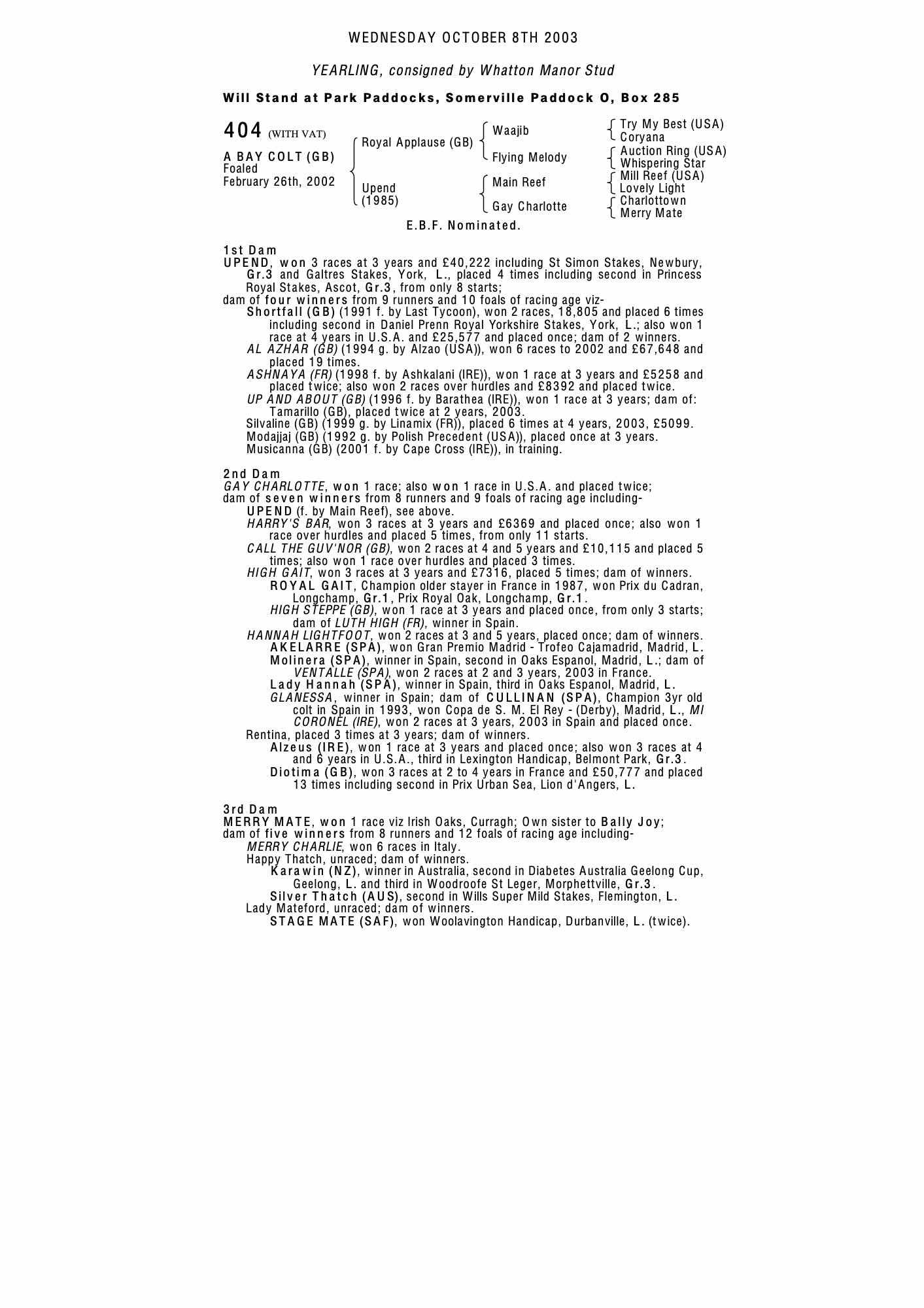 October Yearling Sale 2002 lot 444 F. by Cape Cross (IRE) 2001, Whatton Manor Stud=>C Gordon-Watson Bloodstock 60,000 gns