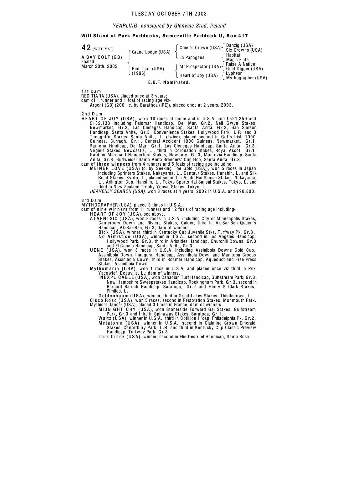 October Yearling Sale 2002 lot 89 C. by Barathea (IRE) 2001, Cheveley Park Stud=>Declan Carroll 30,000 gns
