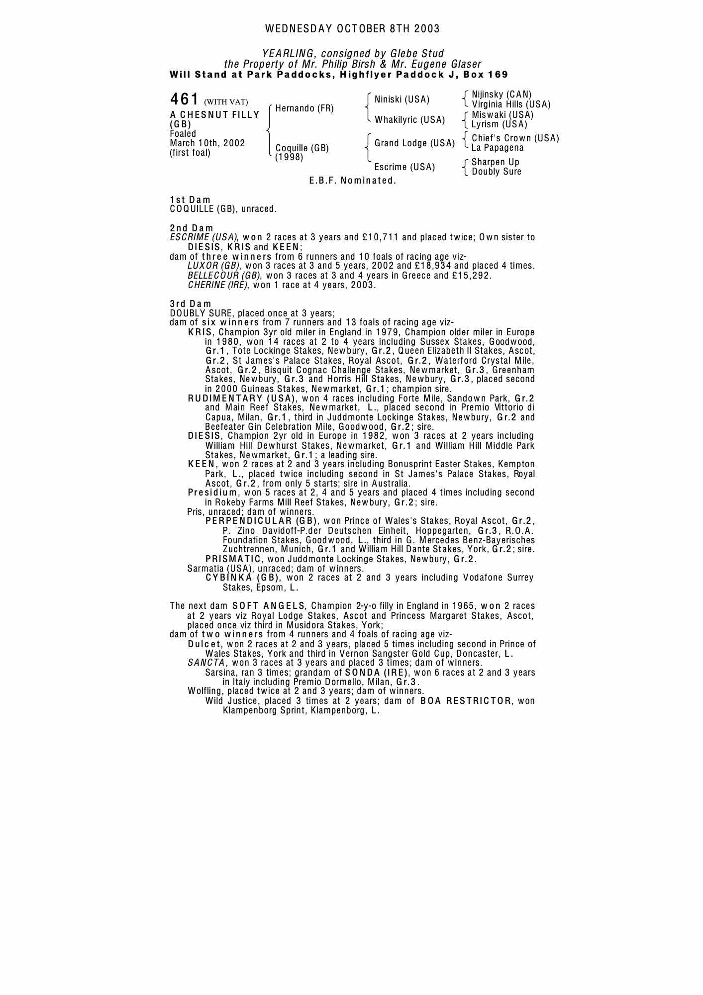 October Yearling Sale, Book 1 2004 lot 670 F. 2003, Glebe Stud=>Vendor 22,000 gns