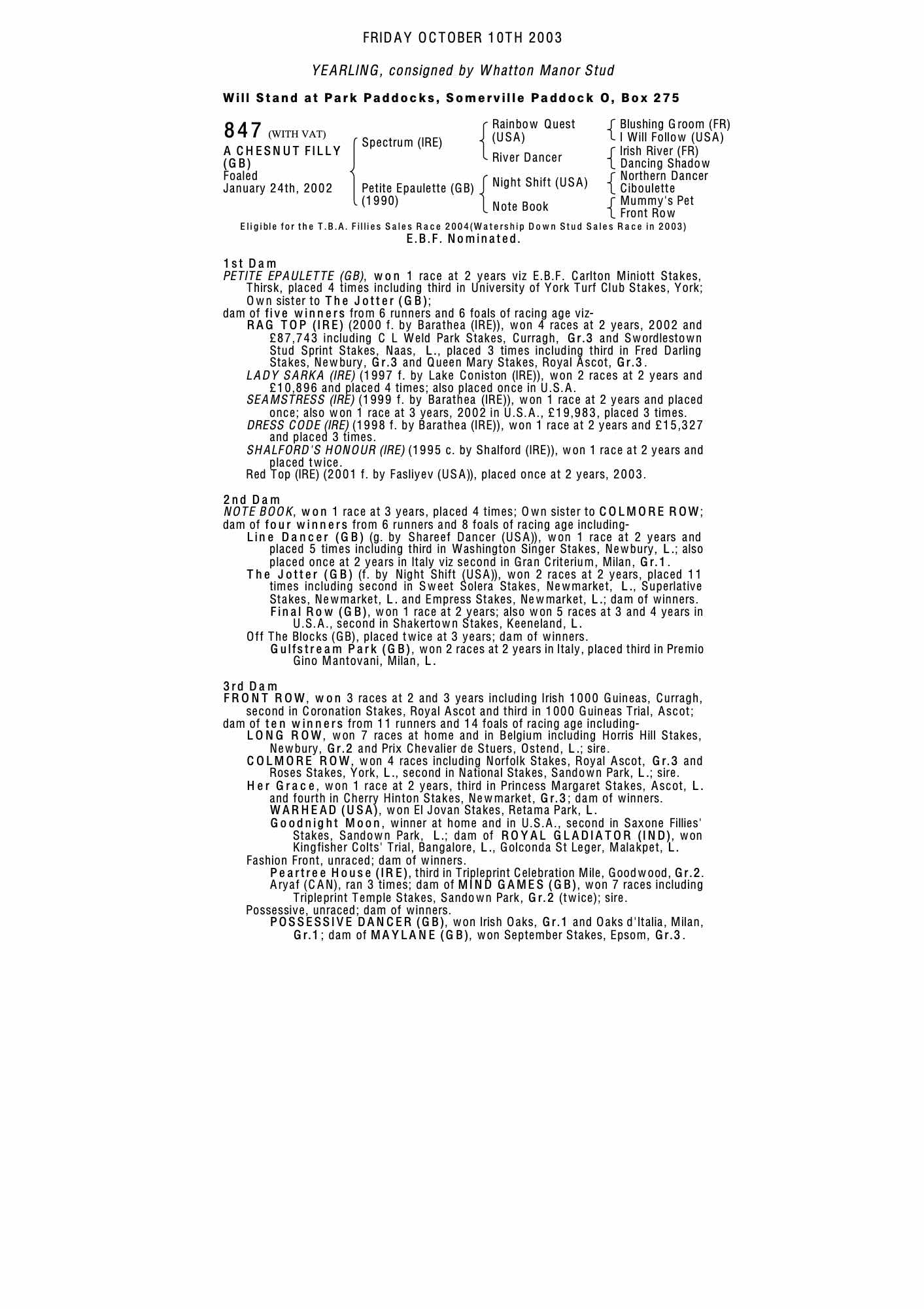 October Yearling Sale, Book 2 2004 lot 1330 F. by Observatory (USA) 2003, Whatton Manor Stud=>Kerr & Co 52,000 gns