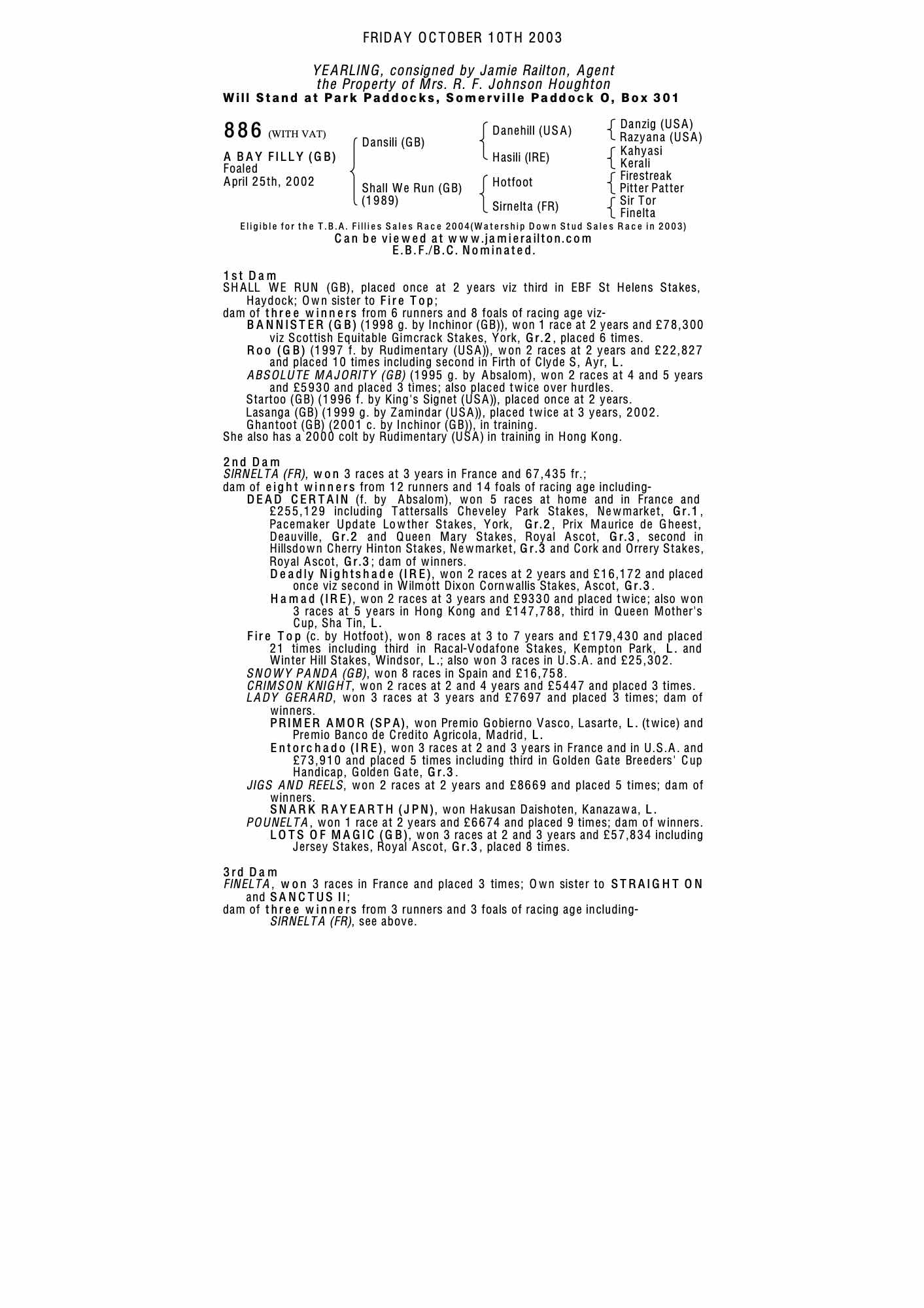 October Yearling Sale 2001 lot 504 C. by Rudimentary (USA) , Jamie Railton, Agent=>BBA Ireland 55,000 gns