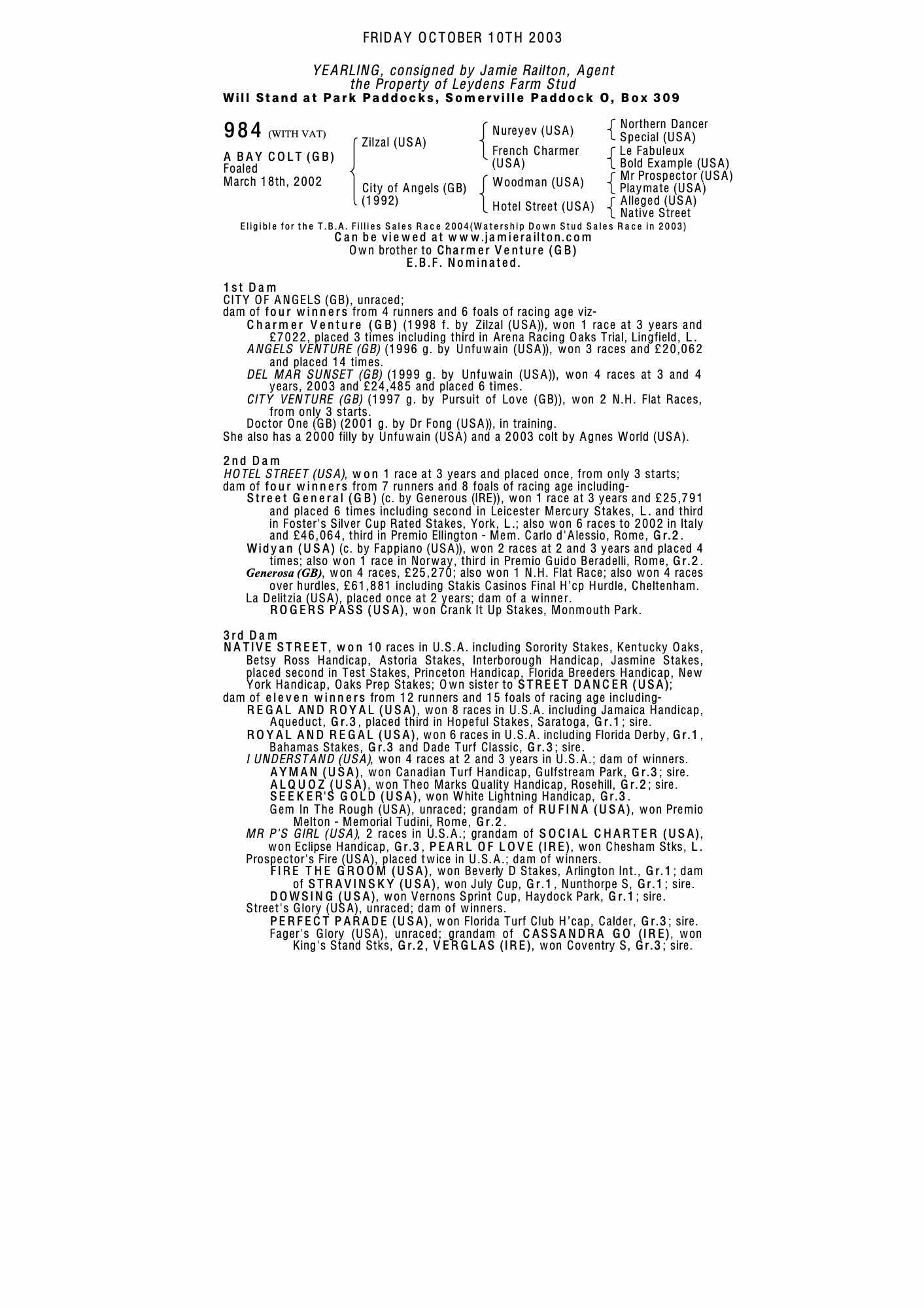 July Sale 2000 lot 306 City Venture (GB) (C. by Pursuit of Love (GB)), La Grange Stables=>David Redvers 10,000 gns