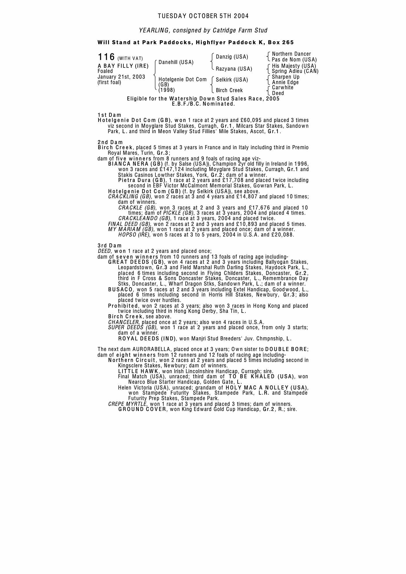 October Yearling Sale, Book 1 2005 lot 295 F. 2004, Catridge Farm Stud=>Demi O'Byrne 220,000 gns