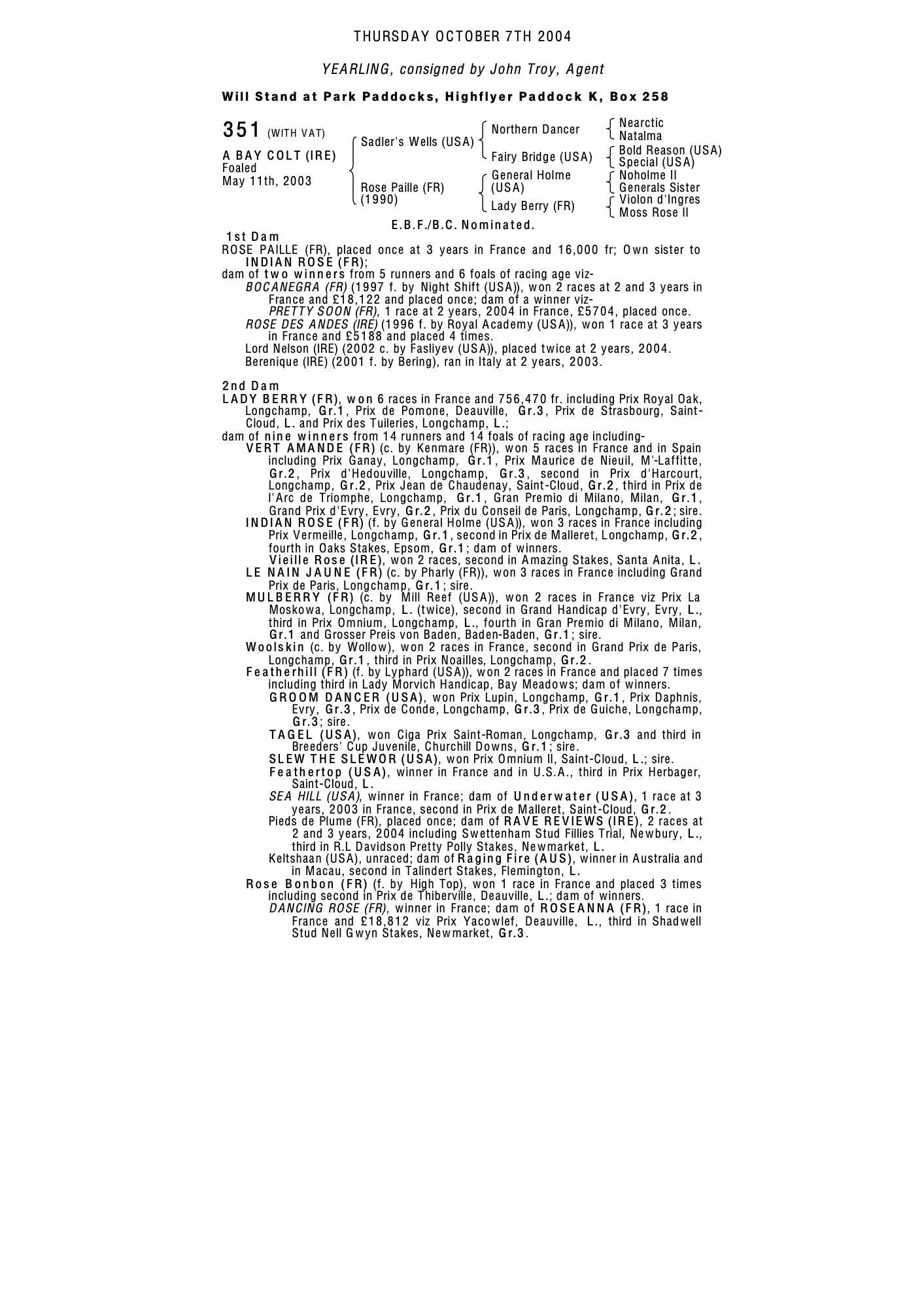 September Yearling Sale 2005 lot 187 C. by Fasliyev (USA) 2004, Whitehall Stud=>Tim Everington €5,000