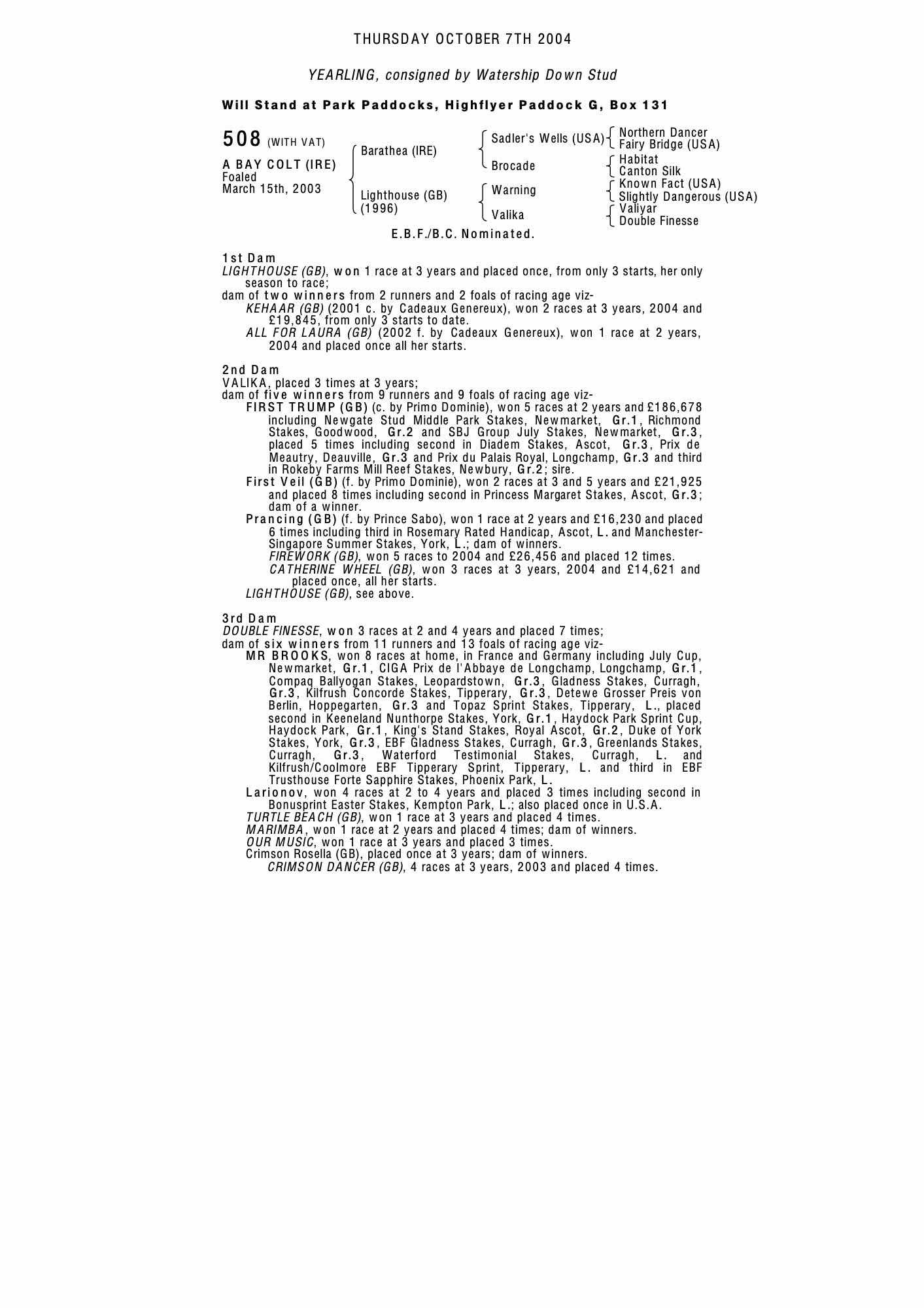 October Yearling Sale 2002 lot 323 C. by Cadeaux Genereux 2001, Watership Down Stud=>B Olsson 170,000 gns