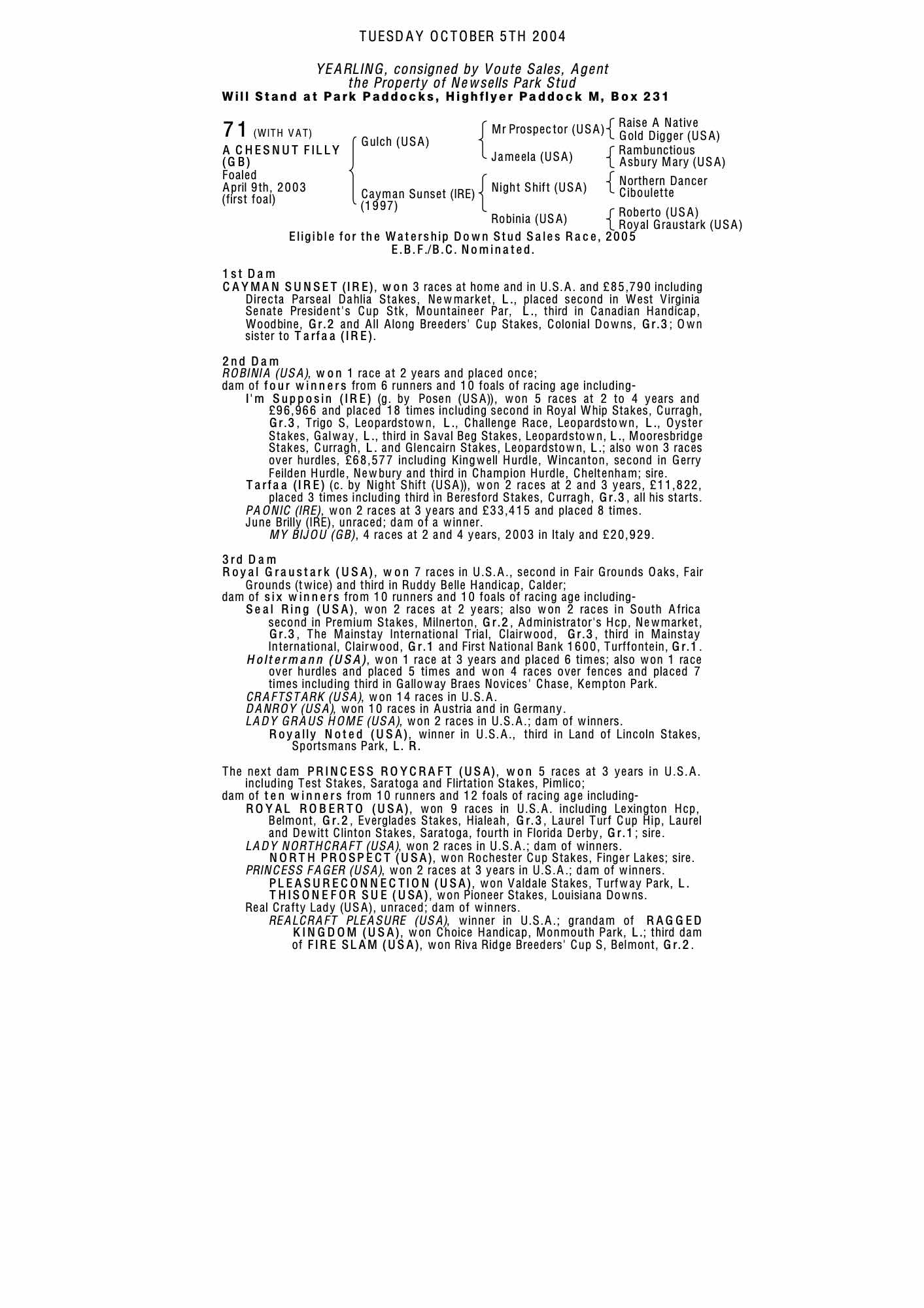 February Sale 2006 lot 132 F. by Vettori (IRE) 2005, Newsells Park Stud=>Service 4 Horses 1,500 gns