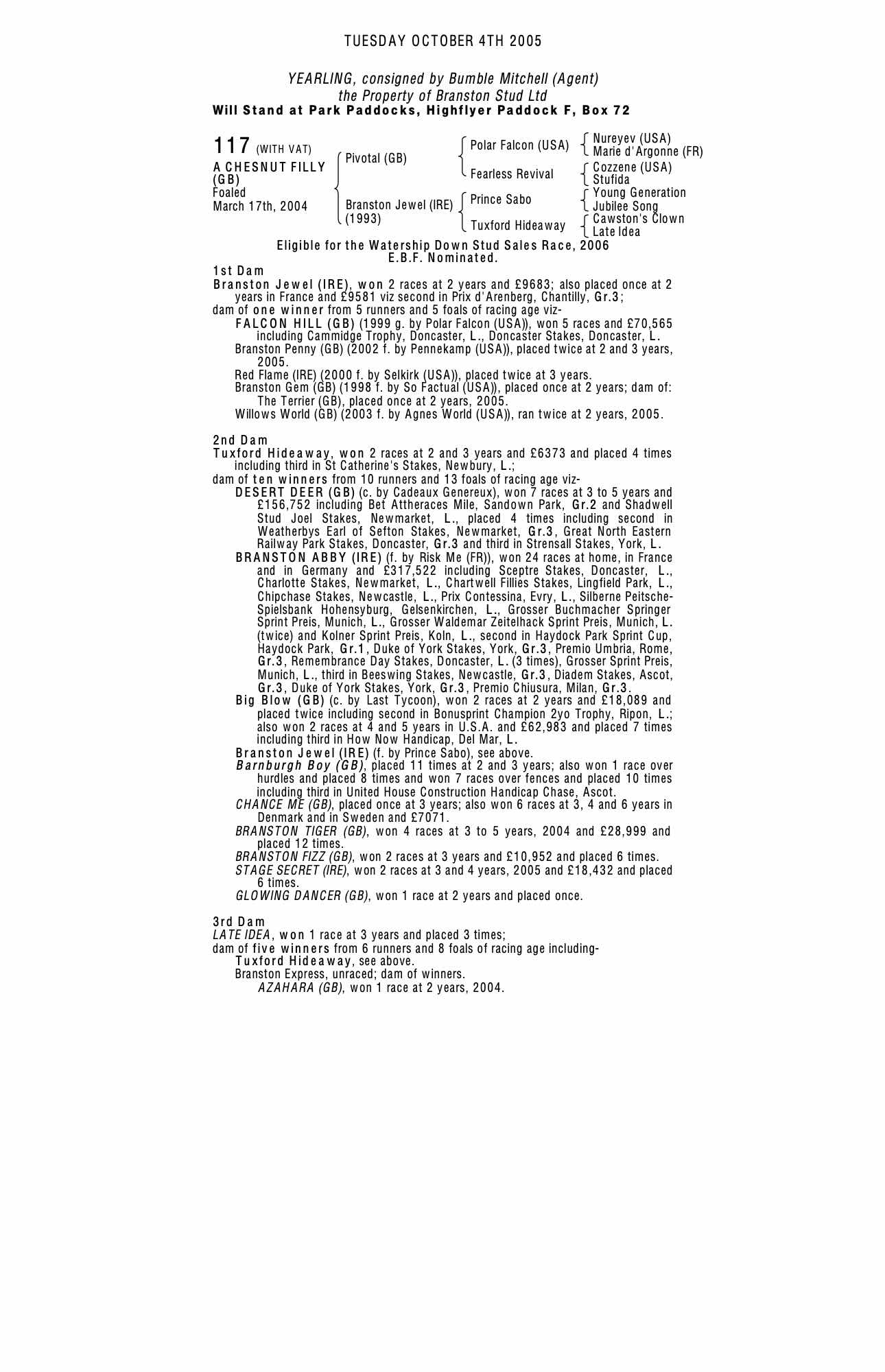 October Yearling Sale, Book 2 2004 lot 895 F. by Agnes World (USA) 2003, Oaks Farm Stables=>Mark Harniman 32,000 gns