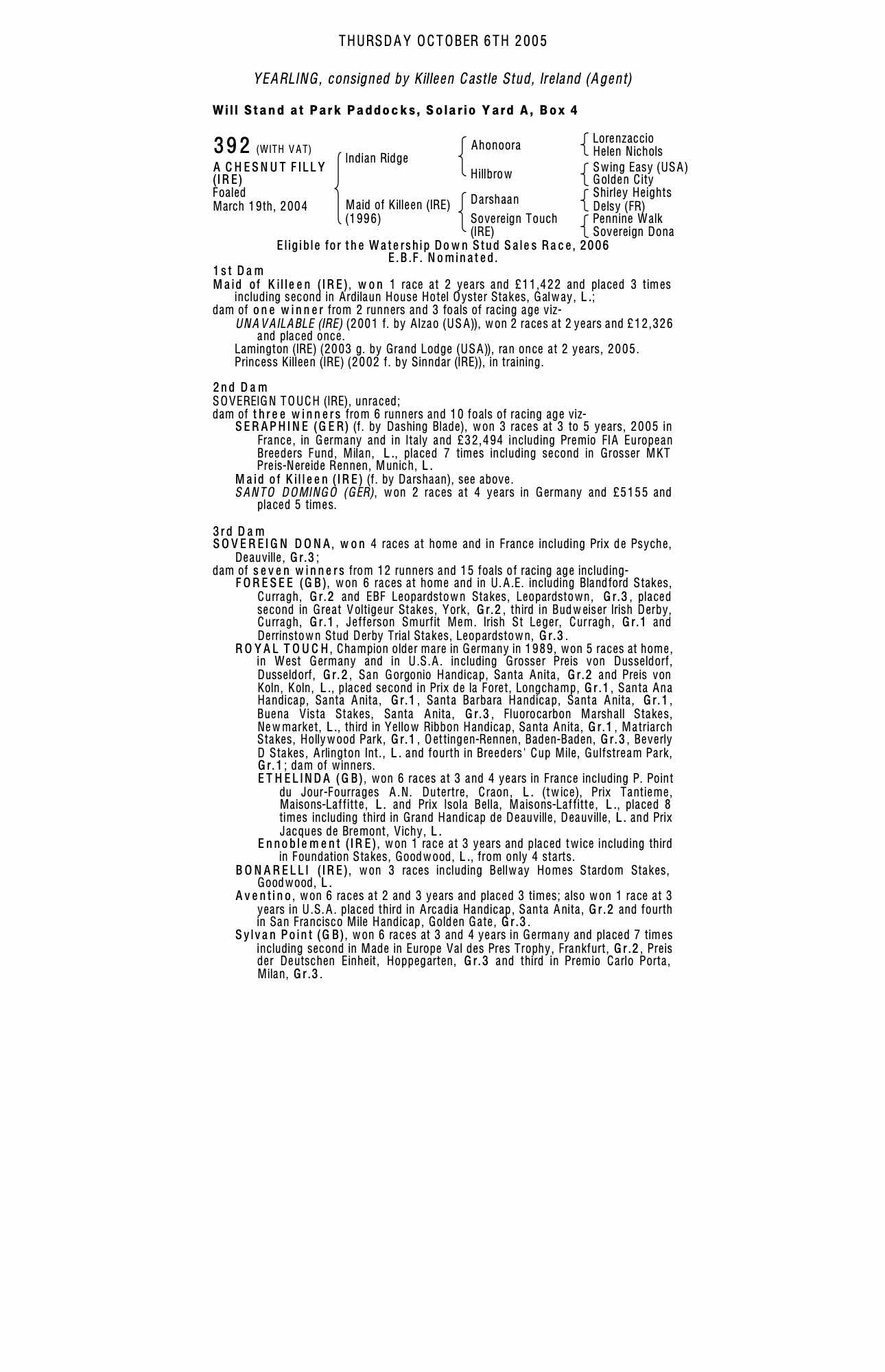October Yearling Sale, Book 1 2003 lot 280 F. by Sinndar (IRE) 2002, Killeen Castle Stud, Ireland=>Lot Not Sold 72,000 gns