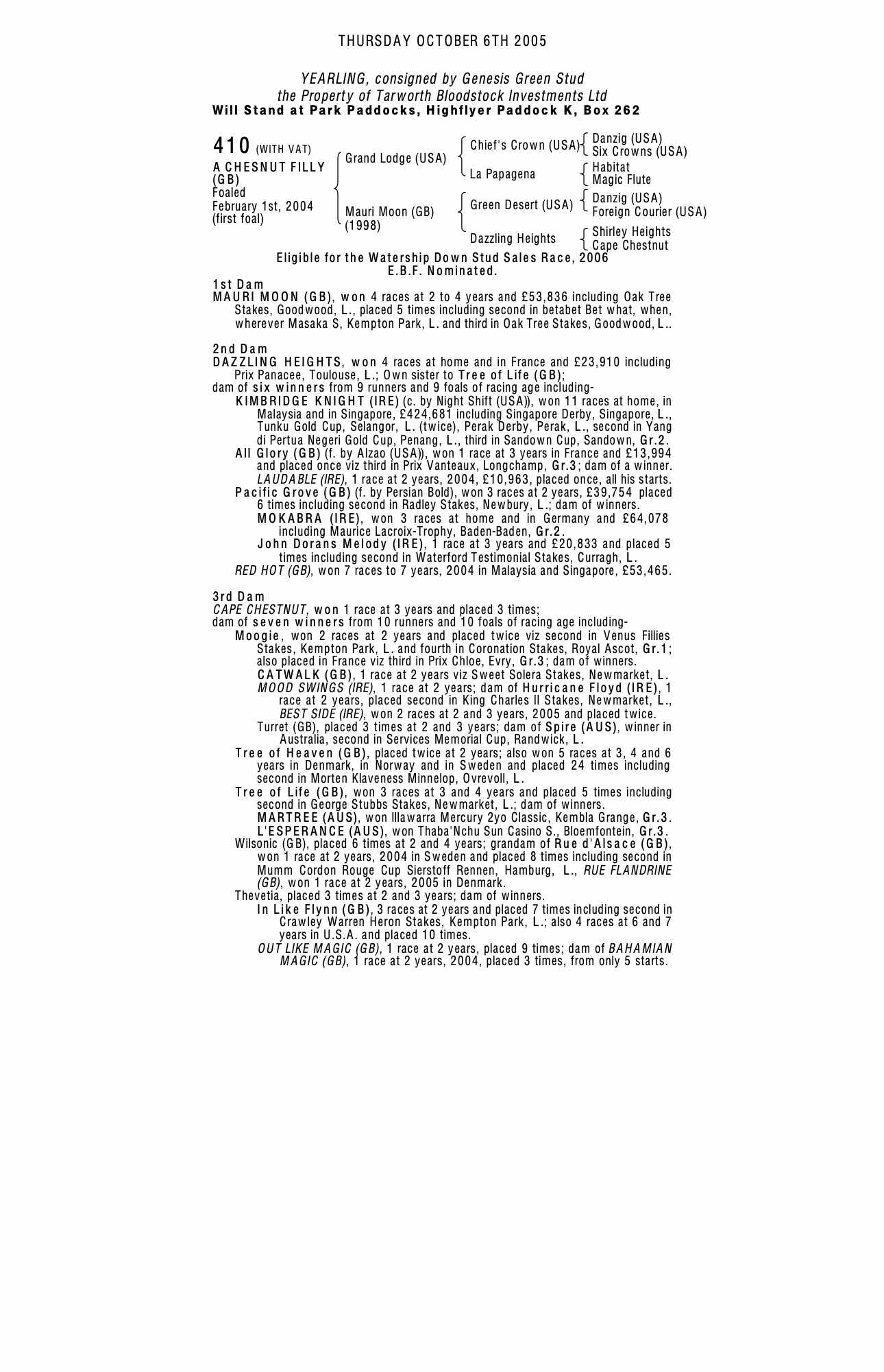 October Yearling Sale, Book 1 2006 lot 303 F. by Pivotal (GB) 2005, Genesis Green Stud=>Shadwell Estate Company 380,000 gns